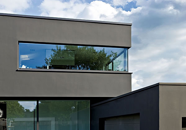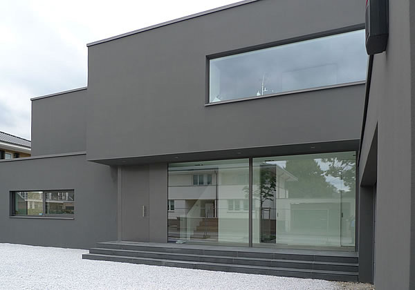 Außergewöhnlich war auch die farbliche Gestaltung der Fassade, die dunkel Anthrazit gleich den Aluminiumfenstern ist.