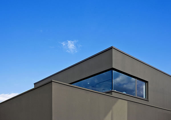 Eine hochlebendige dreidimensionale Kubatur dreht die üblichen Wohngewohnheiten um. Geschlafen wird im Erdgeschoss und gelebt mittels zweier Terrassen mit direktem Gartenzutritt im Obergeschoss.