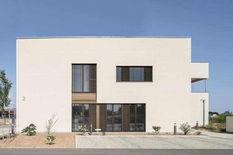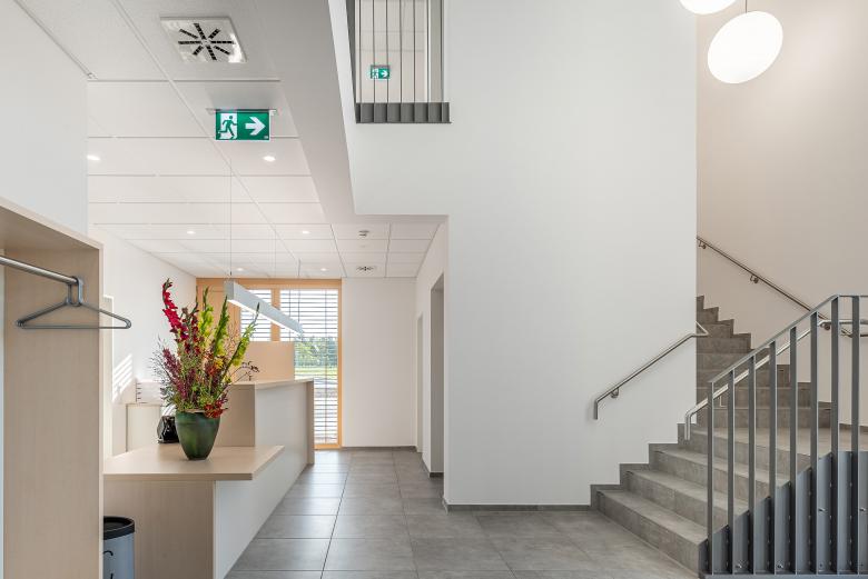 Das Ergebnis: eine moderne Radiologische Praxis, die alle Erwartungen übertroffen hat. Zwei Stockwerke mit insgesamt rund 700 Quadratmetern Nutzfläche und einem Bruttorauminhalt von 4.350 Kubikmetern bilden einen Kubus in schlichter Bauhaus-Manier, dessen Rückseite um wenige Meter auskragt. Wer sich dem Eingang nähert, blickt auf eine großformatige Fensterfront, die fast zwei Drittel der Gebäudevorderseite einnimmt. Der Eingangsbereich ist bis knapp unter die Traufe des Flachdaches verglast. Zwei Einzelfenster im Obergeschoss komplettieren die Gebäudefront. An den übrigen Seiten wiederholt sich das Muster in ähnlicher Weise.