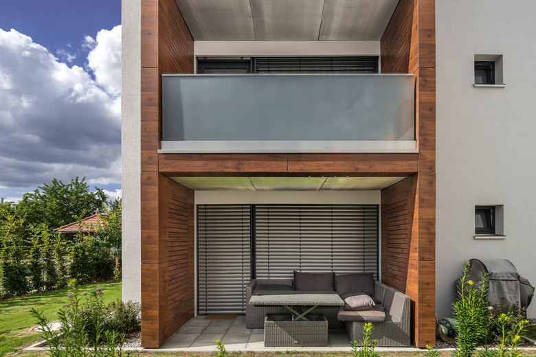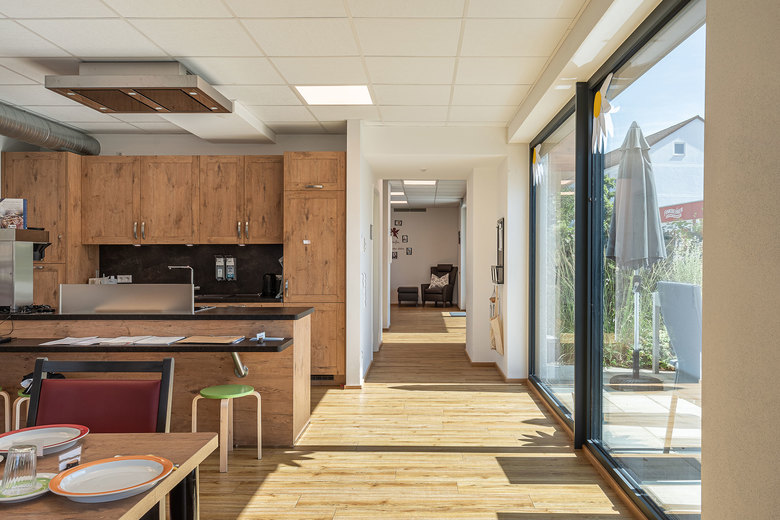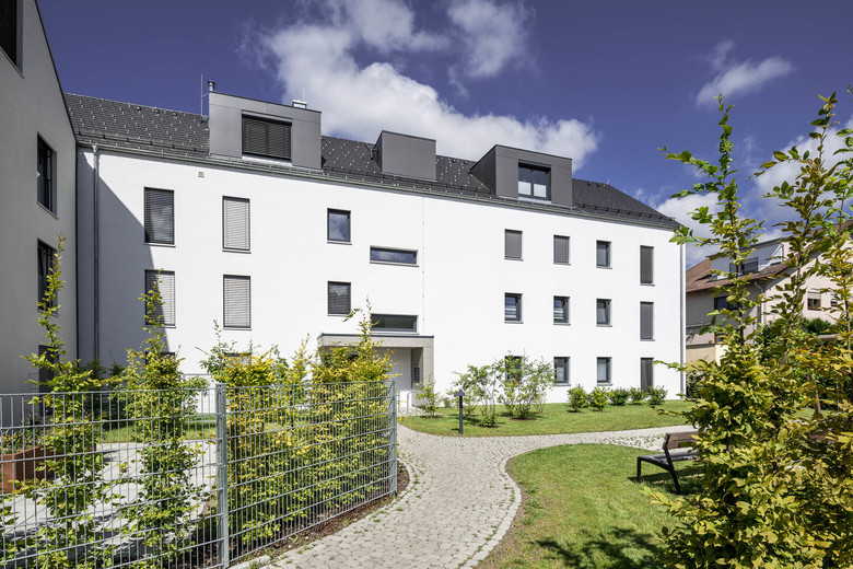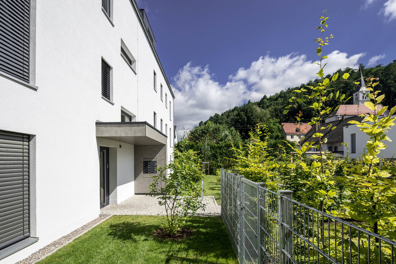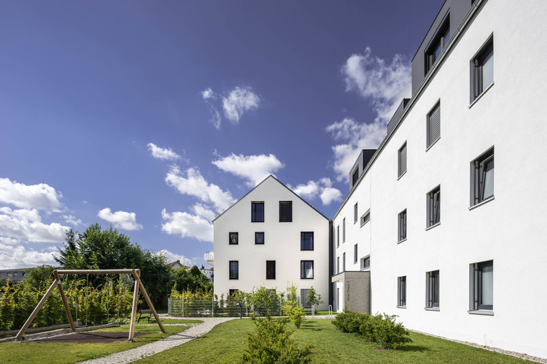 Neben der Ausführung in massiver Ziegelbauweise entschied sich das Planungsteam in Sachen Energetik für eine Luft-Wasser-Wärmepumpe und eine Gas-Brennwertheizung zur Spitzenlastabsicherung. Mit dieser Technik konnte der KfW 70 Standard problemlos erreicht werden. So lassen sich Umweltschutz sowie die gesetzlichen Auflagen zur Heizkostenersparnis hervorragend miteinander vereinen. Eine dezentrale Lüftungsanlage mit Wärmetauscher regelt zusätzlich den Luftwechsel im Gebäude, was insbesondere im Winter die Energiekosten positiv beeinflusst. Zudem kam eine maschinelle Belüftung der zur Straße gelegenen Schlaf- und Kinderzimmer zum Einsatz. Die großflächigen Fenster auf der Südseite lassen auch in der kalten Jahreszeit Sonnenwärme einfallen, in den Sommermonaten können diese mit elektrischen Jalousien beschattet und so die Wohnungen kühl gehalten werden. Auch bei der Gestaltung der Freiflächen legten die Planer Wert auf eine ansprechende Lösung: Parkplätze „verschwanden“ in einer Tiefgarage, was Platz für grüne Außenräume und einen Spielplatz schuf.