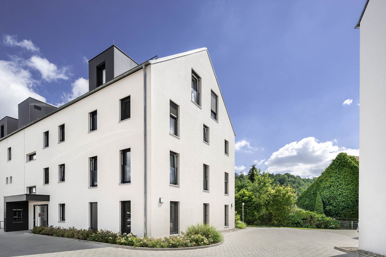 Auch die gestalterische Herangehensweise war den Anforderungen an das Bauen im ländlichen Raum angemessen. Die Eigenheiten und örtlichen Besonderheiten wurden herausarbeitet, im Kern erfasst und für den Entwurf nutzbar gemacht. Elemente und Prinzipien des umliegenden Bestands wurden in Zusammenarbeit von Architekten, Handwerkern und Bauherrenschaft weiterentwickelt und neu interpretiert. Dabei wurde einerseits Wert auf typische traditionelle Erscheinungsformen gelegt – anderseits ist die bauliche Veränderung auch deutlich als neue Zutat erkennbar. Die Architekten des Architekturbüro Nething Generalplaner GmbH verfolgten für das Quartier das Konzept einer „gebrochenen“ Häuserzeile. Das heißt, sie positionierten keinen kompakten Häuserblock auf das freie Grundstück, sondern planten drei versetzte Gebäude mit Giebeldächern, die sich harmonisch in das Ortsbild integrieren. Mit klaren Gebäudeformen, modernen Grundrissen sowie nachhaltiger Bauweise wurden auch die drei Hauptkriterien des Bauherrn erfüllt. So sind attraktive Baukörper in zeitgemäßer Architektur und einer gehobenen, barrierefreien Ausstattung entstanden. Um Wertbeständigkeit und ökologische Verträglichkeit zu steigern, wurden die Häuser komplett in Ziegelmassivbauweise ausgeführt.