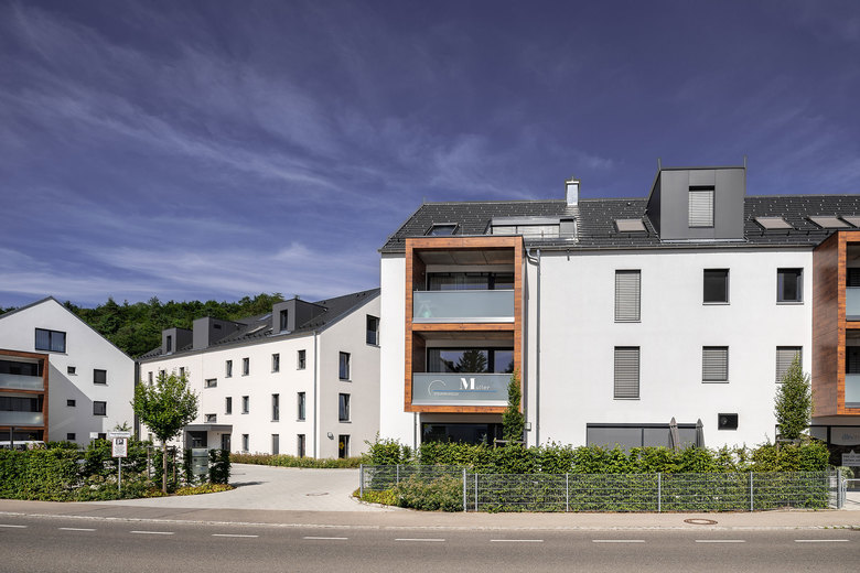 Die drei Häuser wurden als schlanke Quader mit Satteldach und Gauben im Dachbereich ausgeführt. Die schlichten Fassaden werden durch große Fensterflächen dominiert, die Loggien und Balkone erhalten farbige Akzente. Bewusst setzten Bauherr und Architekt auf den nachhaltigen Mauerwerksbau aus Ziegeln. Besondere Herausforderung für die Planung war die direkte Lage an der Ortsdurchgangsstraße. Durch die Verwendung des Planziegel MZ90-G des ortsansässigen Ziegelwerk Bellenberg werden die Anforderungen an den Schutz vor Verkehrslärm mit einschaligen, hoch wärmedämmenden Ziegelwänden erreicht. Somit ist das Ensemble sehr gut gegen Außenlärm geschützt. Der MZ90-G weiß nicht nur durch guten Schallschutz zu überzeugen, sondern auch durch hervorragende Wärmedämmung. Seine Kammern sind mit Pads aus mineralischer Brickrock® Dämmung gefüllt wodurch der Ziegel bei einer Stärke von 36,5 cm einen U-Wert von 0,23 W/m²/K erreicht. Damit konnte auf ein außenwandiges Wärmedämmverbundsystem verzichtet werden. Er ist zudem als Brandwand geeignet. Bei den Innenwänden entschieden sich die Planer überwiegend für den Hochlochziegel ThermoBlock® TS², der im Vergleich zu anderen Materialien eine sehr gute Wärmespeicherfähigkeit besitzt und damit einen wichtigen Beitrag zum Innenraumklima leistet.