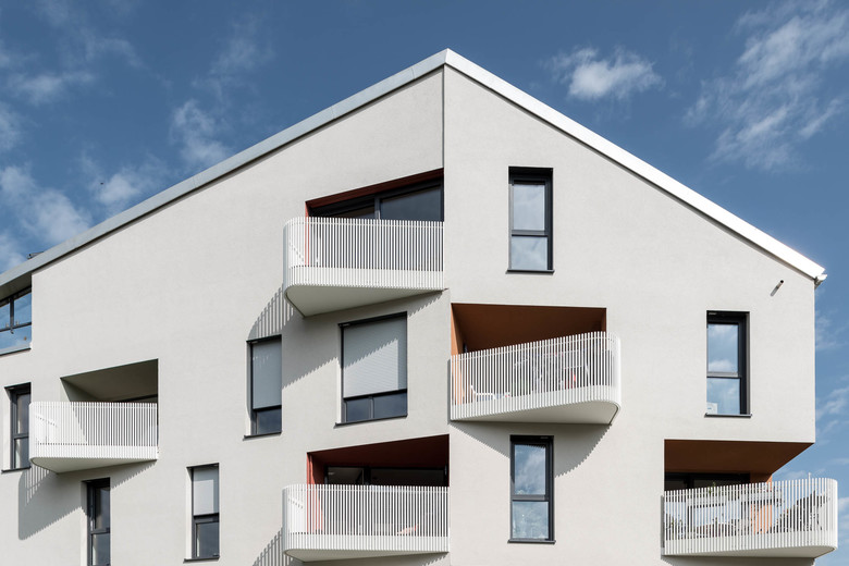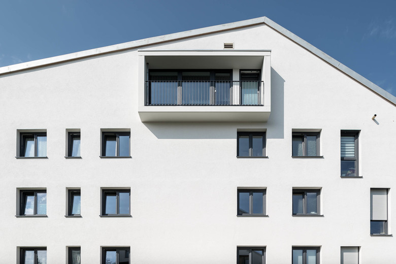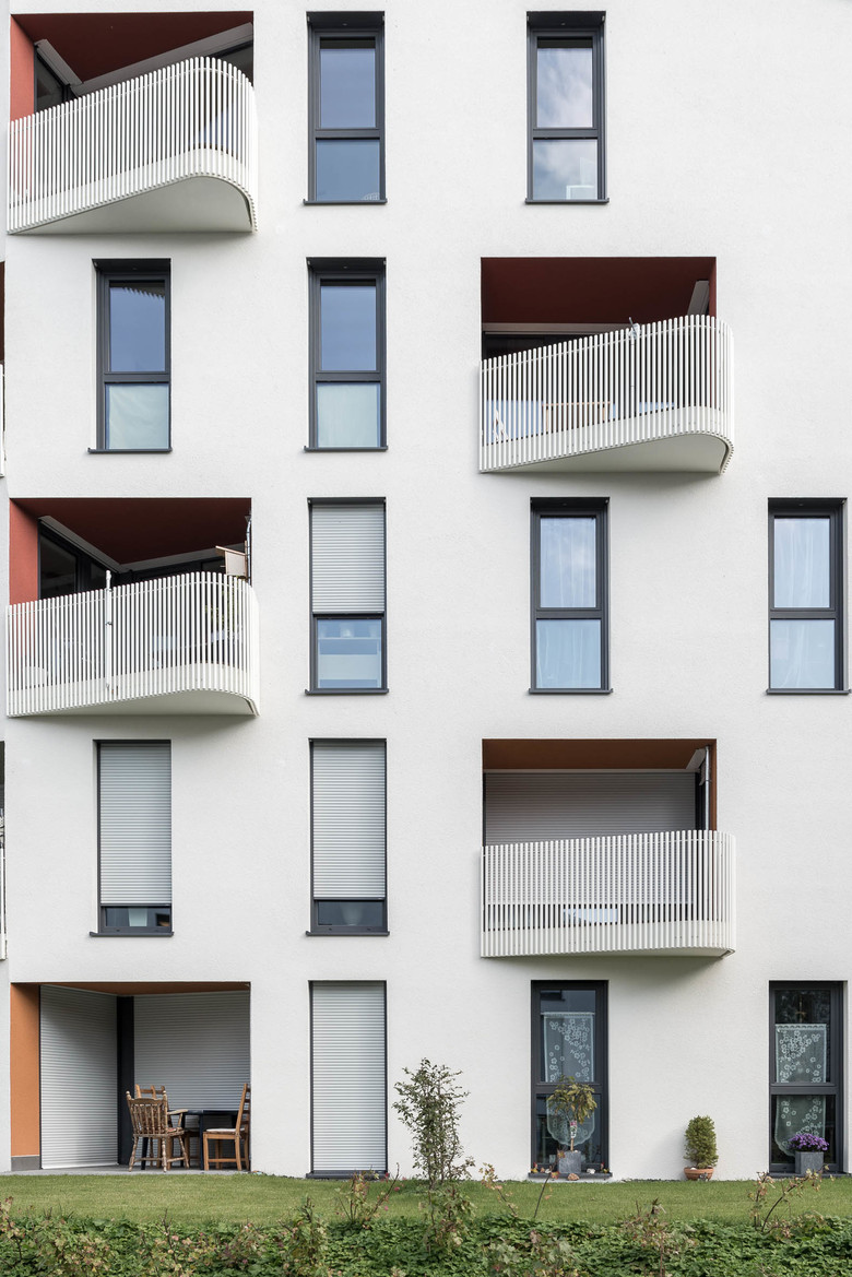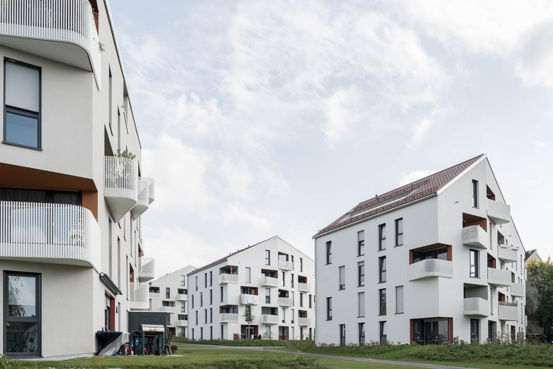 Die insgesamt sechs Häuser wurden allesamt in skulpturaler Kubatur errichtet. Über einen fünfeckigen Grundriss spannte der Planer ein asymmetrisches Satteldach ohne Dachvorsprung. Da sich die Gebäude zur gemeinsamen Grünfläche hin verjüngen, entsteht ein Raumbezug zwischen den einzelnen Baukörpern, der sowohl Weite und Ausblick generiert als auch einen gemeinsamen Kontext schafft. Um die Fassadenflächen aufzulockern wurden die gerundeten Brüstungen der den Loggien vorgelagerten Balkone von schmiedeeisernen Konstruktionen im Stil der Gründerzeit geschmückt. Diese, wie auch die Fenster, wurden geschossweise versetzt angeordnet. Sie brechen dadurch die beherrschte Formensprache der Baukörper.