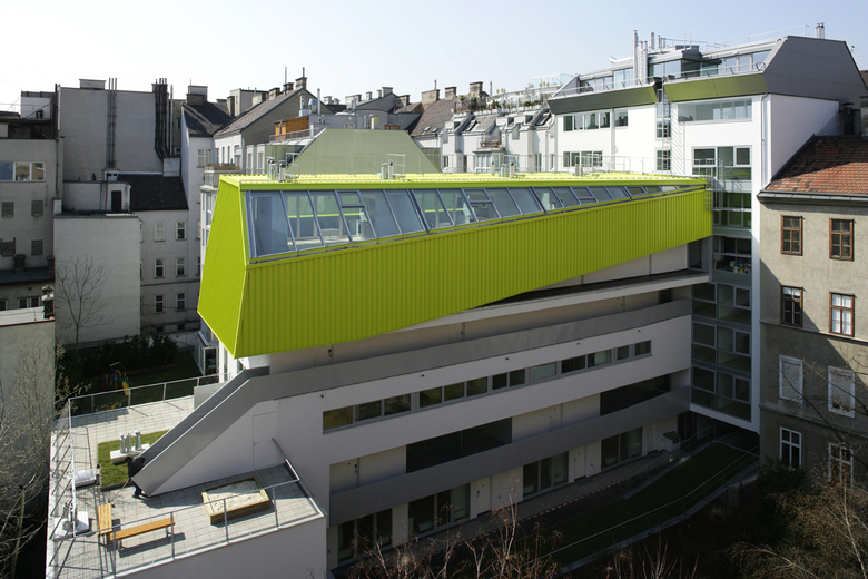 (…) man schrieb einen geladenen Wettbewerb zum Neubau aus, den gerner°gerner plus mit einer differenzierten Baukörperformation gewannen. Ein schmaler, vom rapsgelben Dach gekrönter Wohnriegel flankiert den grünen Hofweichteil, um sich straßenseitig mit knochenartig “dickem Ende” ins Mark der Stadt einzuklinken.