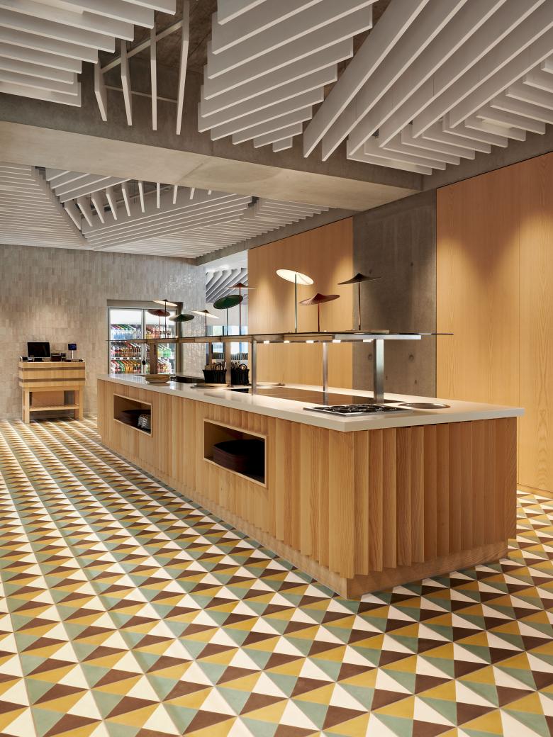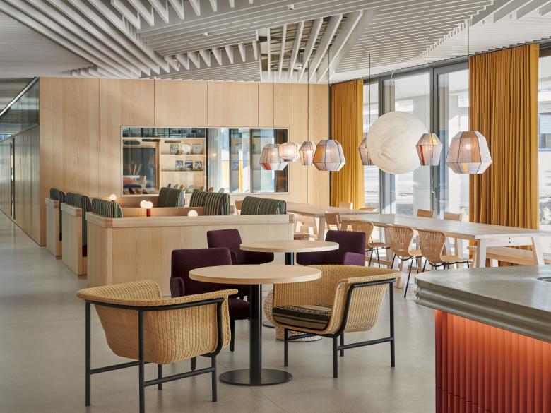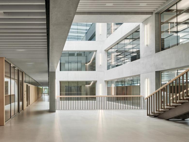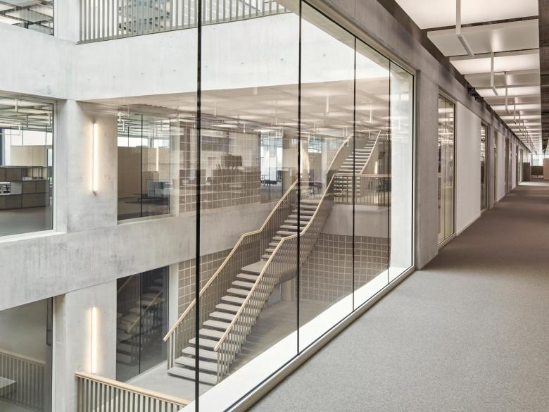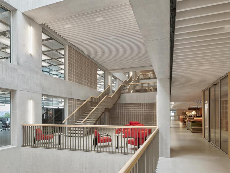 Die Gebäudehülle besteht aus vorgefertigten Fensterelementen und horizontalen Bändern aus vorgehängten, reliefierten, naturbraunen Keramikelementen. Das Innere wird geprägt durch eine robuste Primärstruktur in Sichtbeton, eine systemgetrennte Gebäudetechnik mit abgehängten Akustikkühlsegeln, welche auch als Reflektoren für die indirekte Beleuchtung dienen, sowie Trennwänden in furnierter Esche.