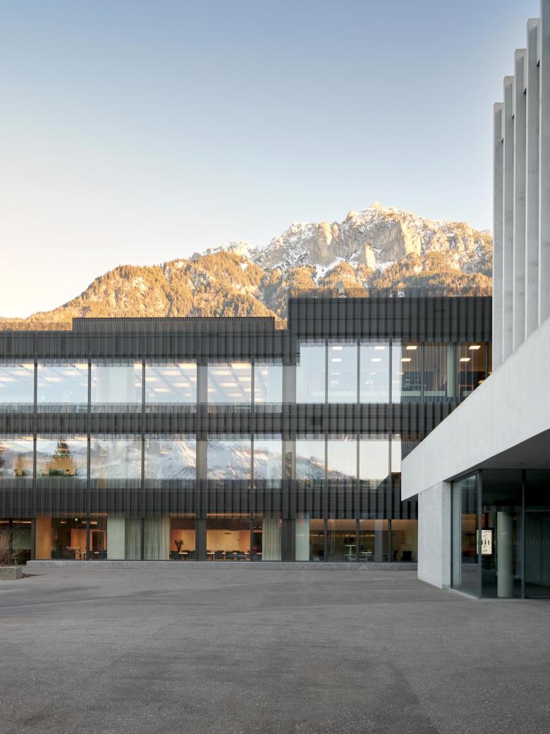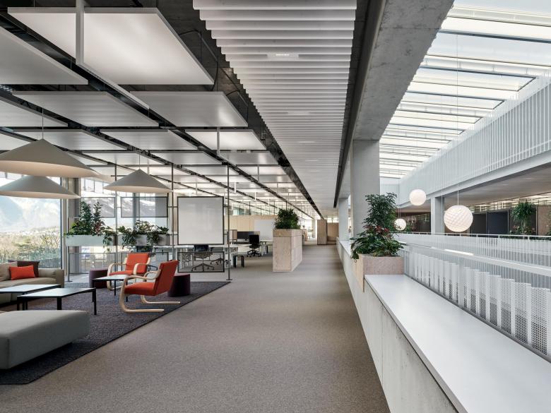 Das Bürogebäude Office Mitte bildet den dreigeschossigen baulichen Hintergrund des Vorplatzes anstelle der ursprünglichen Industriehalle. Innerhalb des neuen Campus Hilti, entsteht mit den angrenzenden Gebäuden ein aufeinander bezogenes Ensemble zwischen Park, Vorplatz und Feldkircherstrasse.