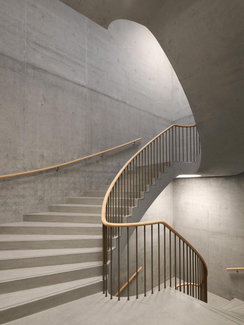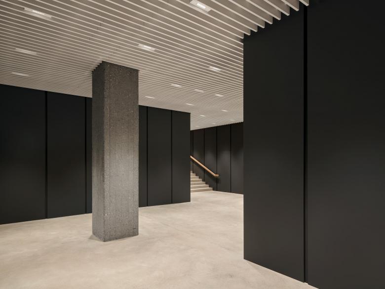 Die Gebäudehülle besteht aus vorgefertigten Fensterelementen und vorgehängten, grosswelligen Lochblechbänder. Das Innere wird geprägt durch eine robuste Primärstruktur in Sichtbeton, eine systemgetrennte Gebäudetechnik mit abgehängten Akustikkühlsegeln, welche auch als Reflektoren für die indirekte Beleuchtung dienen, sowie Trennwänden in furnierter Esche.