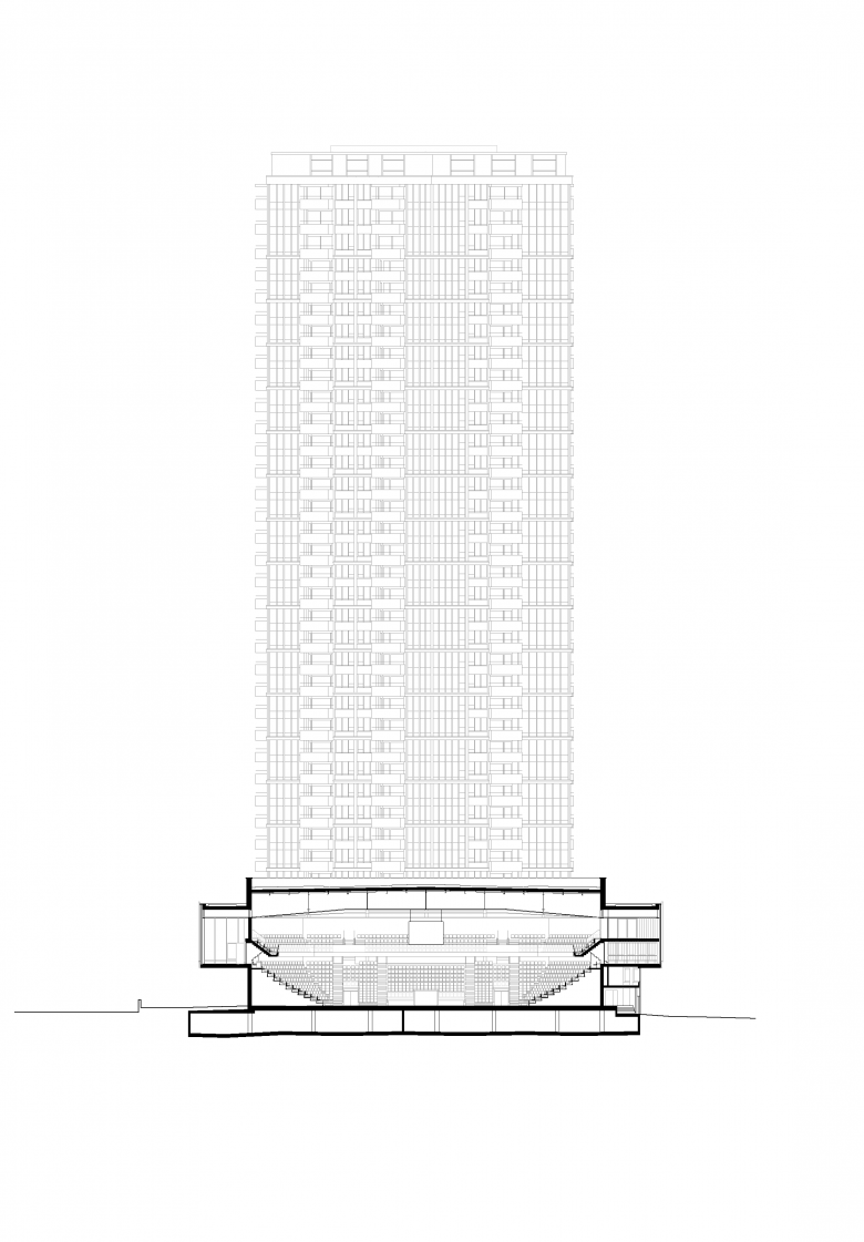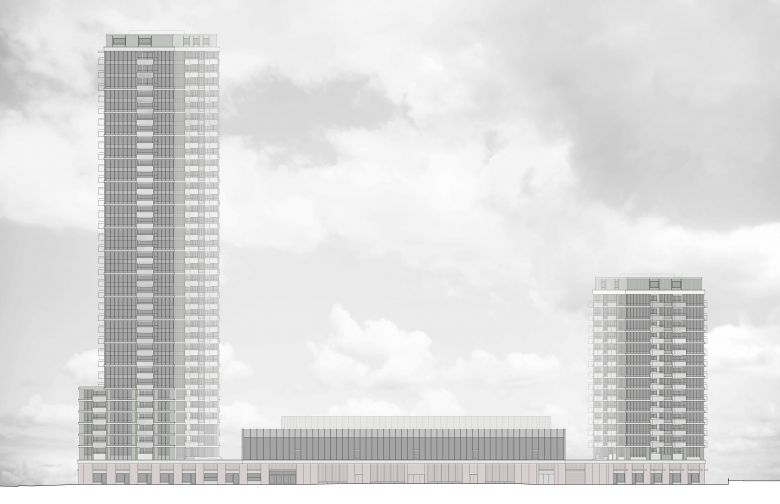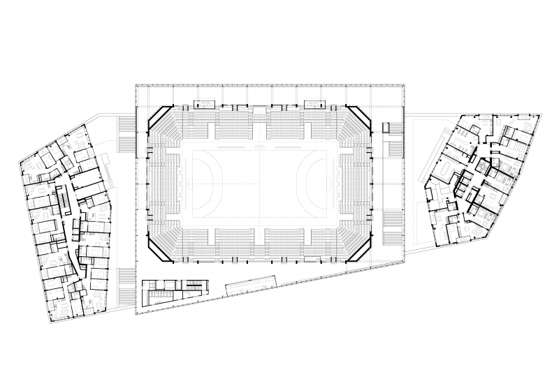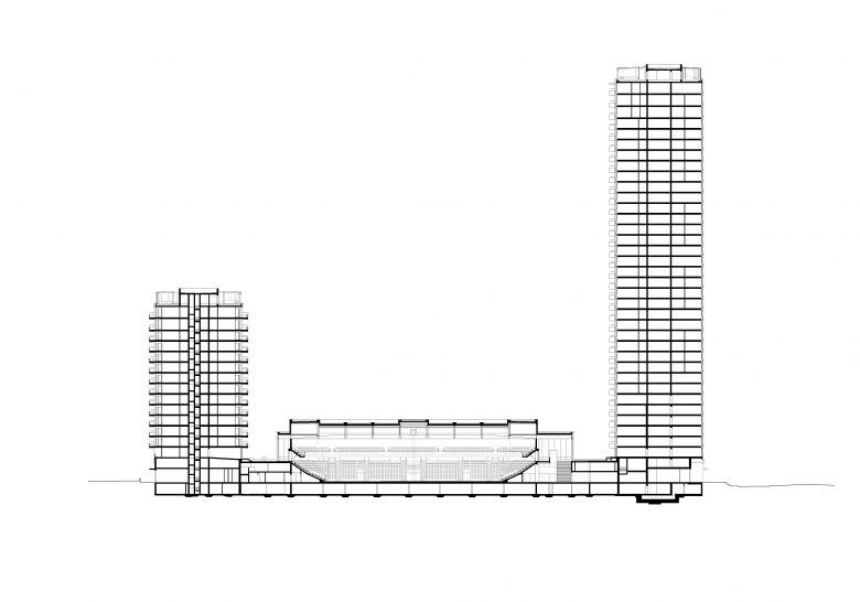 Das erhöhte Foyer der Arena erscheint als verglaster Stadtbalkon, welcher über dem Sockel schwebt und den Blick auf Promenade und Quartier freigibt. Die Verglasung ist fein vertikal gegliedert und verleiht der Arena eine laternenhafte Erscheinung. Die Wohntürme erhalten durch die zweigeschossige Gliederung und Rhythmisierung mit Pfeilern, Gesimsen und Wandflächen eine angemessene architektonische Erscheinung.