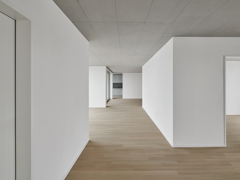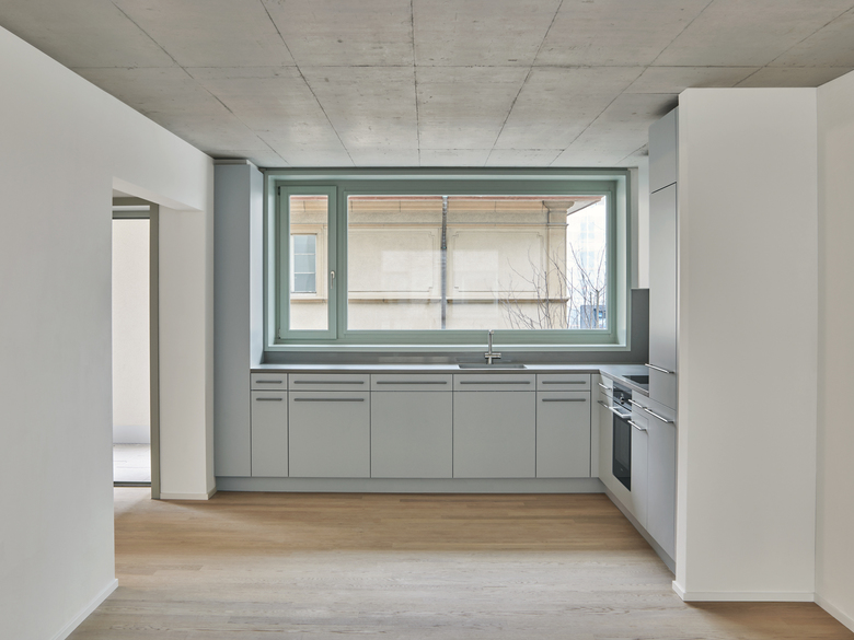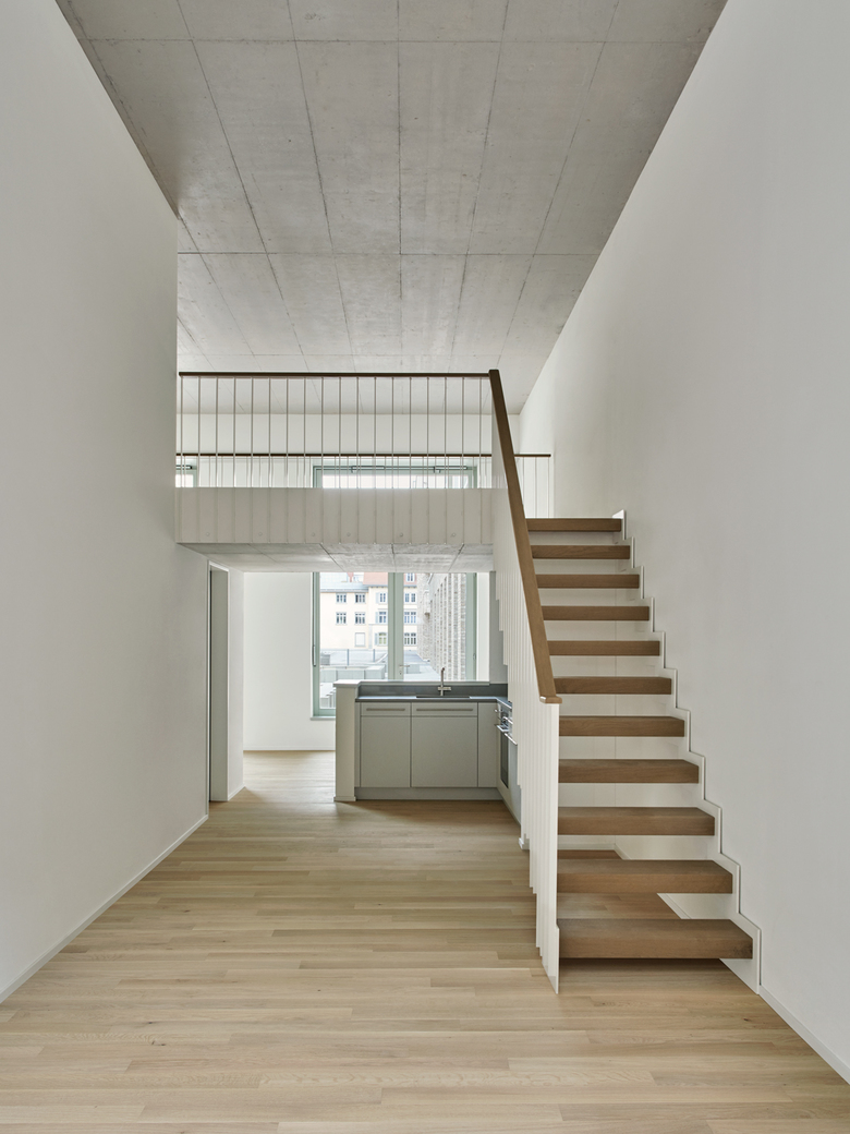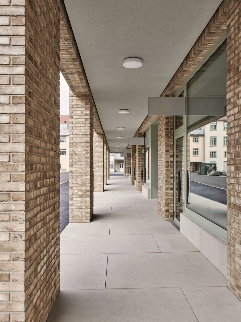 Arkaden entlang den Bestandsbauten erlauben attraktive Zugänge zu kleinen Gewerbeeinheiten. 164 Mietwohnungen und Wohnateliers zwischen 1.5 bis 4.5 Zimmern mit verschiedenen Charakteren schaffen ein vielfältiges Wohnungsangebot.