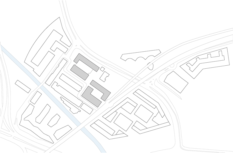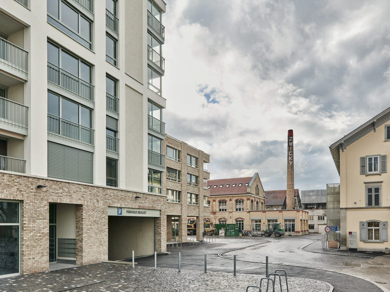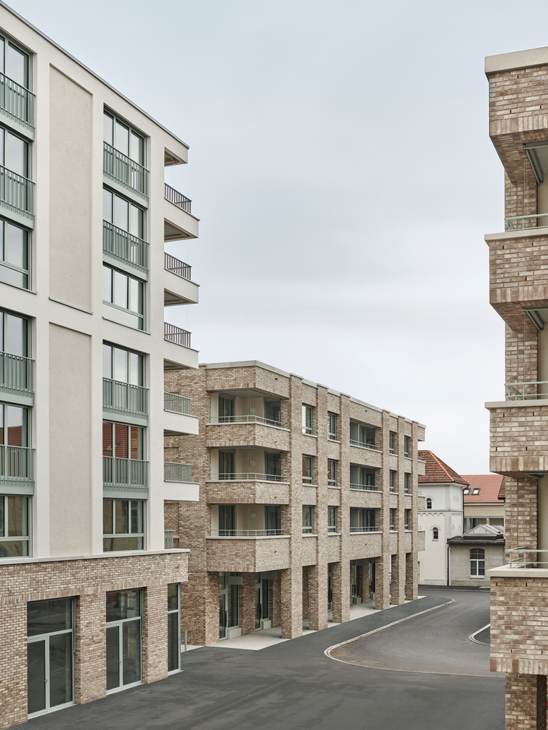Im umgenutzten Industrie-Areal bildet ein Ensemble von aufeinander bezogenen Bestandes- und Neubauten ein neues Quartierzentrum. Viergeschossige Bauten gegenüber gleich hohen historischen Gebäuden und siebengeschossige Bauten gegenüber den lärmexponierten Verkehrsräumen schaffen halböffentliche, geschützte Hofräume.