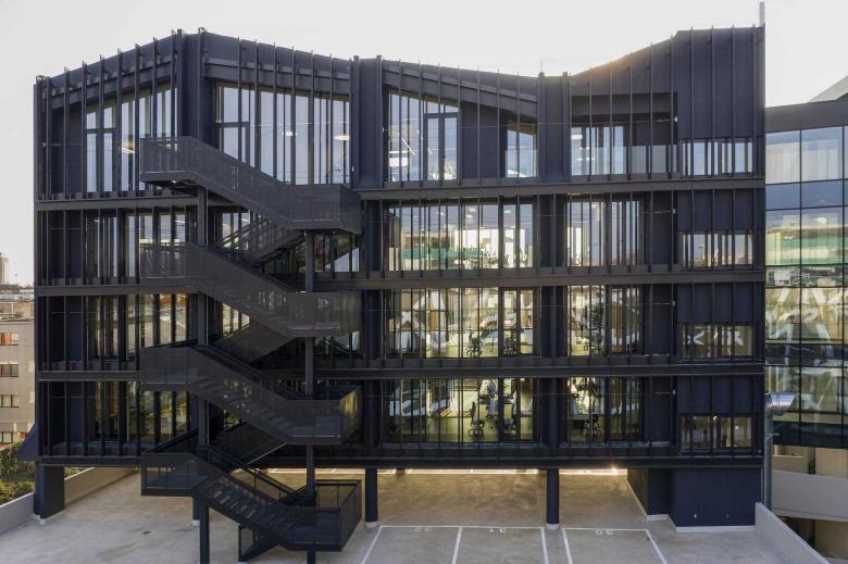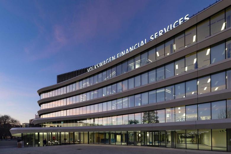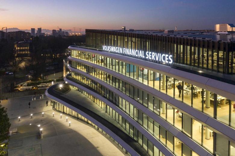 Sede del nuovo headquarter di Volkswagen Leasing GmbH e Volkswagen Bank GmbH, l'edificio, completamente rinnovato grazie al progetto sartoriale dello studio dell’architetto Giuseppe Tortato, che vanta un’esperienza ventennale nel settore della rigenerazione urbana, si presenta con un'architettura sinuosa e dalla forte personalità, caratterizzata da un contrasto raffinato tra il bianco dei fascioni curvilinei a sezione variabile che abbracciano l'edificio sul fronte strada ed il grigio antracite che caratterizza i volumi spigolosi e tesi del resto dell'edificio. Un involucro di design che racchiude spazi flessibili portando benessere a chi ci lavora e dove sono stati “inseriti” elementi naturali quali l'aria, la luce ed il verde, utilizzandoli quasi fossero materiale da costruzione.