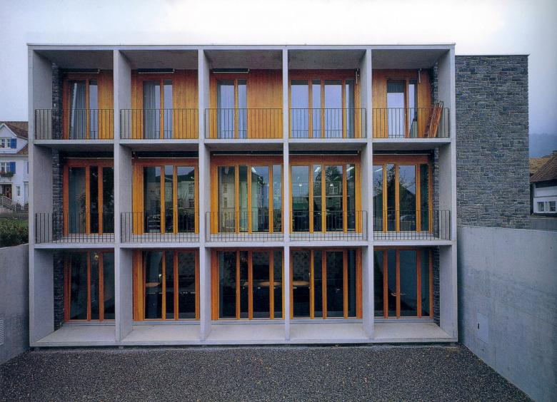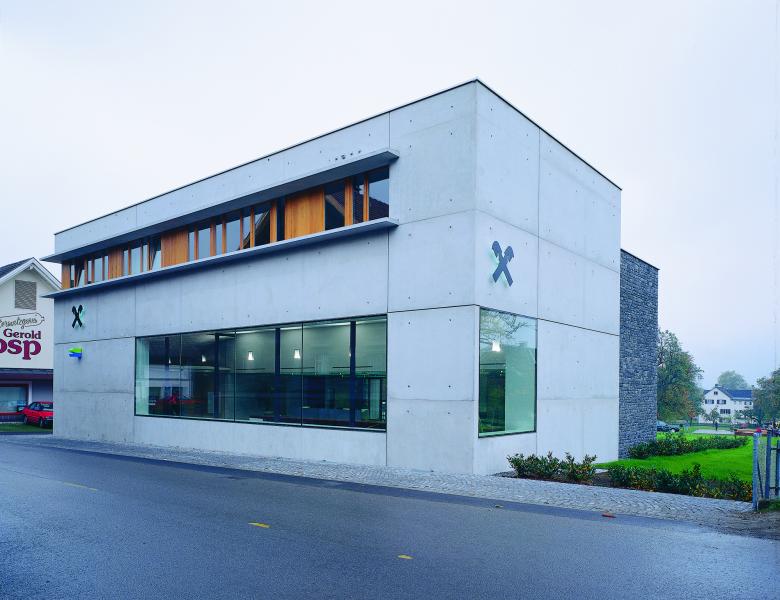 Das überraschend Janusköpfige dieses Hauses, das in der Dorfmitte von Satteins auf urbane Weise Geschäfts- und Wohnzwecke verbindet, drückt sich baukörperlich aus: Glätte und Rauigkeit, Flächigkeit und Tiefe, Transparenz und Abschluss. Zur Straße im Erdgeschoss die Bankhalle mit aufgesetzten Wohnungen, an der Seite die Eingänge zu Bank und Wohnungen, zum Garten und zum Tal eine aufgelöste Fassade. Der Entwurf setzt offenbar auf Gegensätze: zwischen den Materialien (glatter Sichtbeton an der Straßenfront, an den gartenseitig vorgebauten Sonnenschutz- und Aussichtsveranden, scharf gefasstes Glas und grauer Naturstein am Mittelbau, feingliedriges Holz am Nebenbau), zwischen Raumschichten (verschieden hohe Bereiche der Kundenhalle; Niveauunterschiede zwischen abgesenktem Garten und Straße). Ein Werk, das in seiner unmittelbaren Materialität und Körperlichkeit eher an Architekturen der Tessiner „tendenza“ erinnert, denn an das Baukünstlertum. Somit: eine Andeutung einer Entwicklungslinie für die Vorarlberger Architektur, und wohl die bisher reifste Realisierung von G & H.