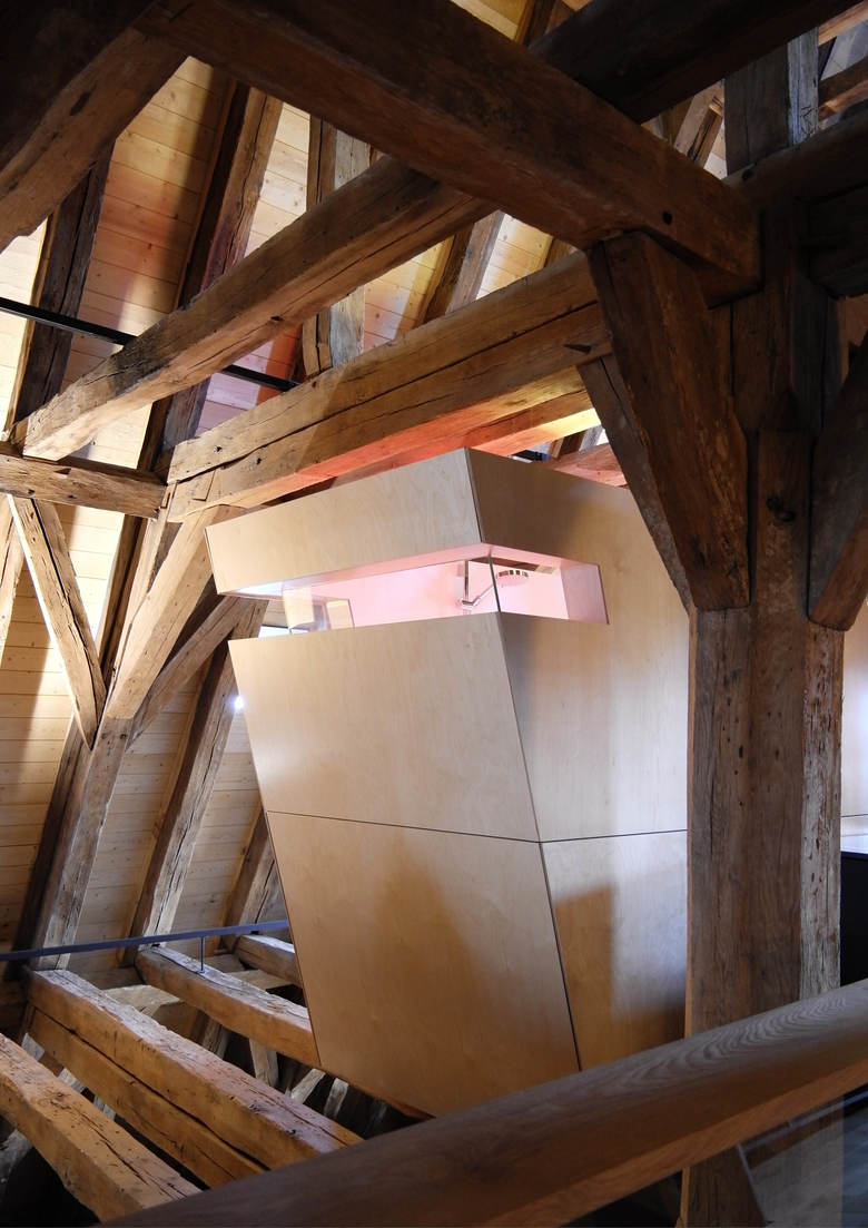 Neu eingefügte räumliche Architekturelemente interpretieren unterschiedliche Raumsituationen in dem ca. 500 Jahre alten Gebäude. Das Dachgeschoss ist als „hoher Raum“ mit seiner ursprünglichen Holzkonstruktion erlebbar. In den Geschossen wird ein „Raum in Raum“ – Konzept verfolgt. Räume werden als eigenständige Kuben platziert und von der Außenwand gelöst.