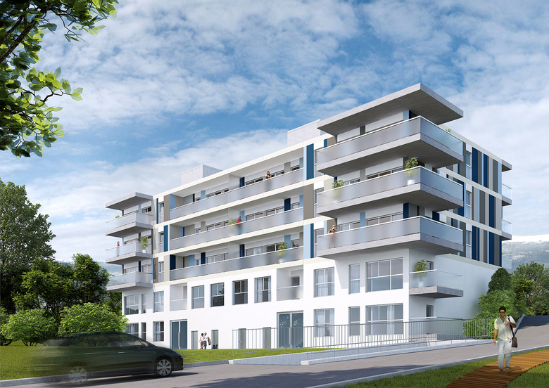 Le socle en crépi gris clair, les cages d'escaliers et les balcons en béton apparent contrastent avec la partie plus légère de la façade ventilée allant du 1er étage à la toiture.