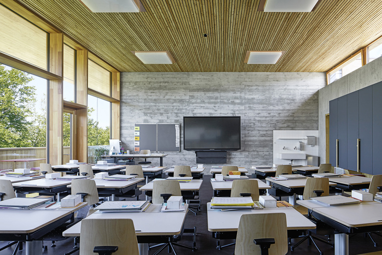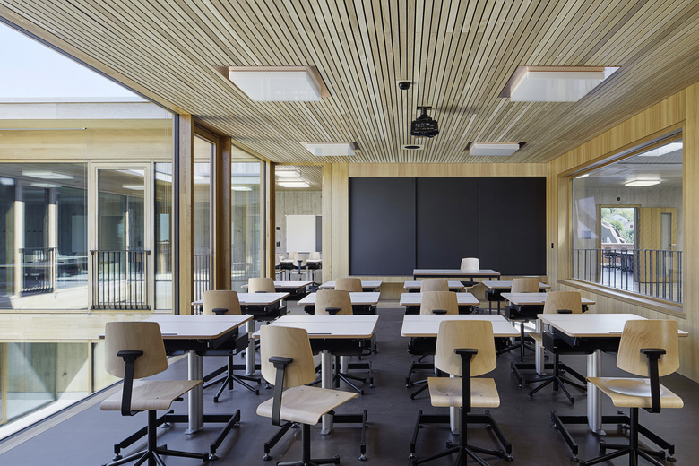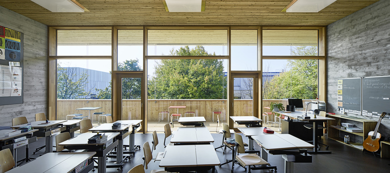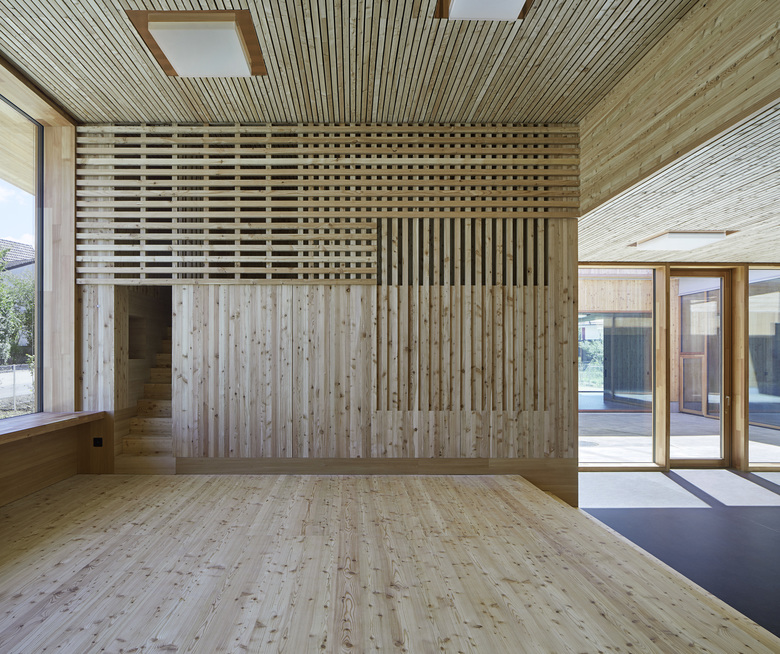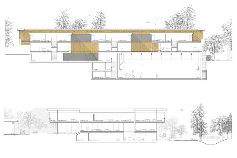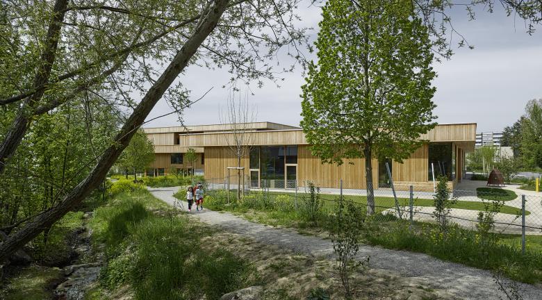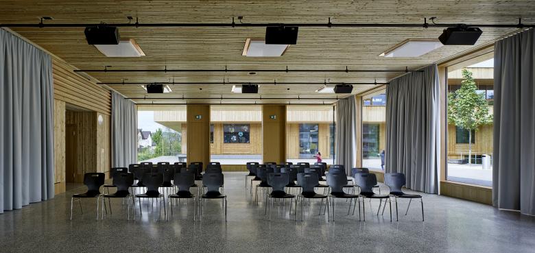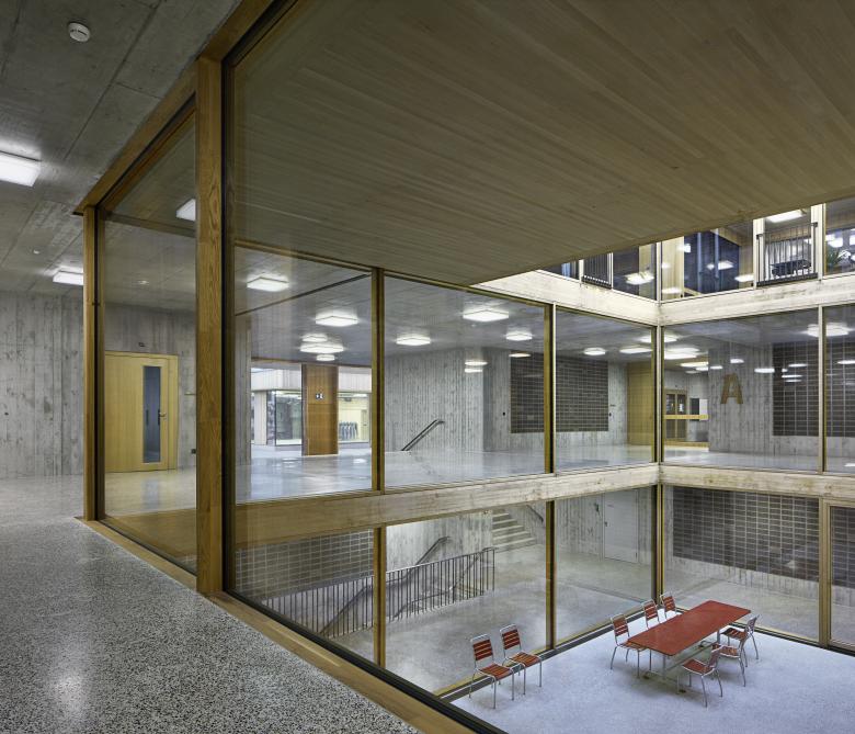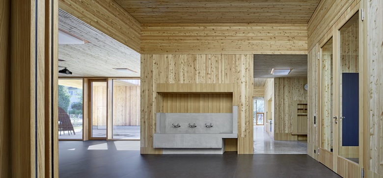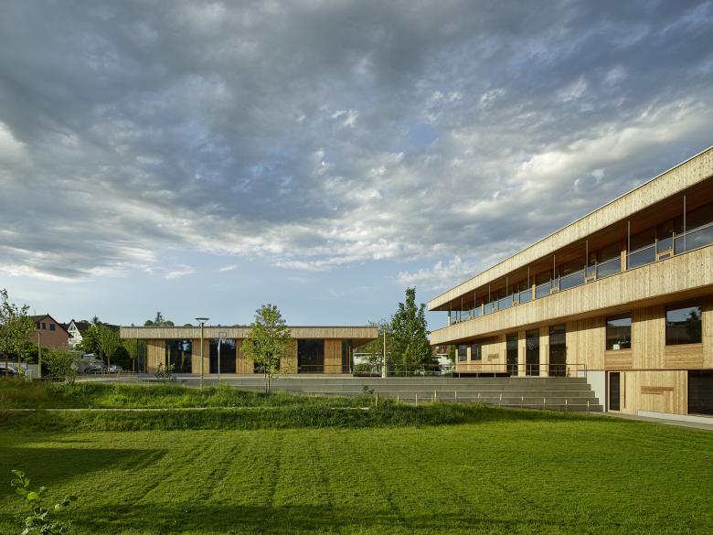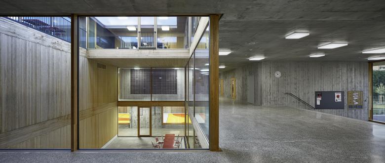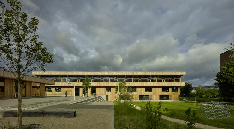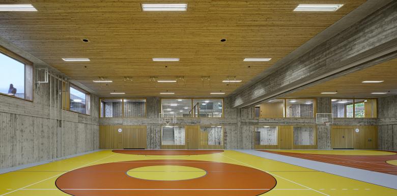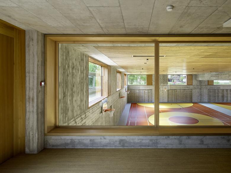 Im Kindergarten werden architektonische Themen des Schulhauses altersgerecht weitergeführt wie z. B. der Hof, die Raumstaffelung, die differenzierten Raumhöhen, und die mehrseitige Belichtung. Die Aula stellt ein polyvalentes Raumgefäss dar mit eigener Adresse für die Schule und die Öffentlichkeit. Die gewählte Organisation ermöglicht eine wandelbare Bespielung und räumliche Anpassung je nach Anlass. Mit der Mischbauweise (Zwischendecken, Innenwände massiv, Dächer und Aussenwände in Holz, Fassade in Skelettbauweise aus Beton) wird eine nachhaltige, recyclingfähige, grauenergiearme oekonomische Konstruktion gewählt. Das Material sowie die Formal zurückhaltende äussere Erscheinung welche durch architypisch-traditionelle Bauelemente, wie zum Beispiel die Holzfassade mit schützenden Vordächer, geprägt wird, lädt die Kinder zur aktiven Inbesitznahme und dem Begreifen des Gebäudes ein. Wo möglich werden Baumaterialien, die Technik sowie die räumlich strukturelle Ordnung unverkleidet sichtbar gehalten.