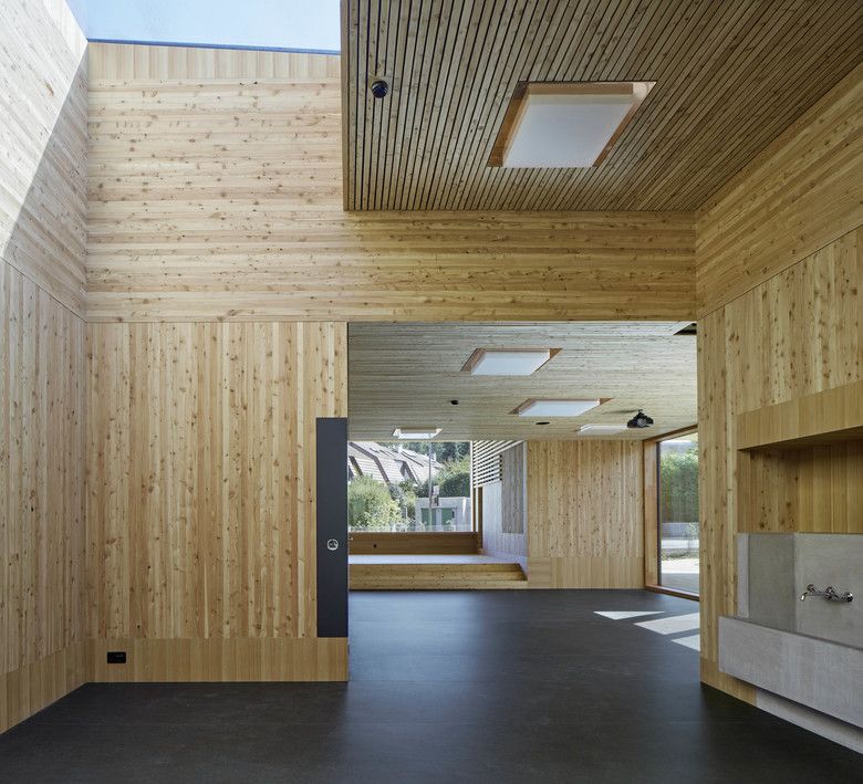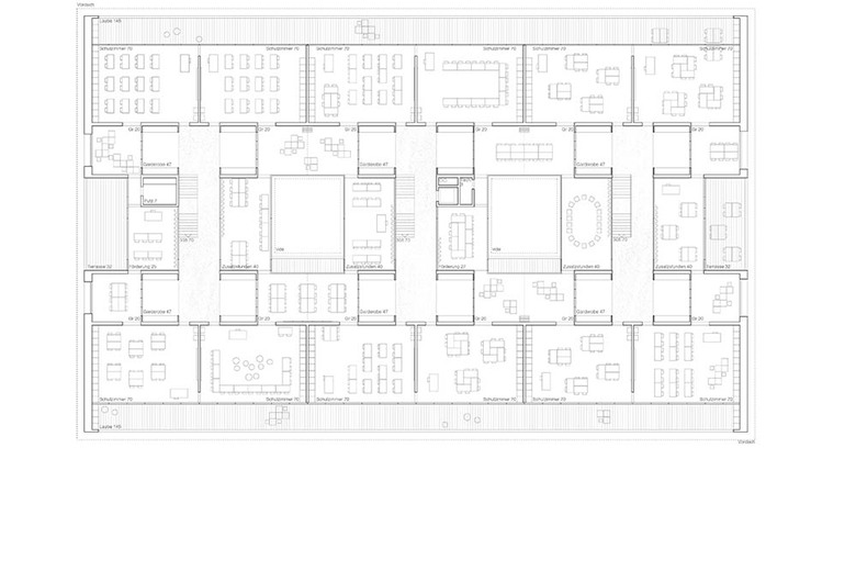 Das Schulareal befindet sich an der Nahtstelle dreier unterschiedlicher städtebaulicher Muster – westlich zu grossflächigen Gewerbehallen des angrenzenden Industriegebietes, nördlich zu punktförmigen Mehrfamiliengebäuden im Grünen und zu kleinen Einfamilienhäusern im Osten und Süden. Die zweiseitig begleitenden Bäche, die Blickbezüge zur bewaldeten Hügelkette im Osten und der Fernblick zum Blauen prägen die Atmosphäre des Ortes stark mit. Die städtebauliche Gradation, die raumprägende Fliessrichtung des Marchbaches mit seinem dichten Baumbestand, und die Geometrie des Areals formt die Baukörper und definiert die Aussenräume. Einem Geschwisterpaar ähnlich, bilden das Schulhaus mit integrierter Tagestruktur und Turnhalle sowie das eingeschossige Aula- und Kindergartenhaus zwei verwandte Gebäude. Die flachen Baukörper mit Bodenkontakt spannen unterschiedliche Aussenräume im Areal im Bezug zur Landschaft und Bebaung auf. Das Stapeln von Turnhalle und Schulnutzung bildet die Basis für eine in die Fläche entwickelte Lernlandschaft im 1. Obergeschoss welche über drei einläufige „Familientreppen“ mit jeweils vier Klassen via Eingangshalle vom Pausenplatz erreichbar ist. Zur Orientierung, zur Belichtung und zum visuellen Bezug der unterschiedlichen Nutzungen und Räume werden zwei begrünte Innenhöfe über zwei und drei Geschosse in das Volumen eingeschrieben. Die Cluster-Typologie des Schulgeschosses ermöglicht die Bildung von individuellen, kommunikativen Lernumgebungen unterschiedlichster Art und Grösse. Sämtliche Hauptklassenräume sind zweiseitig belichtet (Morgensonne) und erhalten dem Schulzimmer vorgelagert, ein „Sommergruppenraum“ in Form einer gedeckten Laube. Dies ermöglicht das temporäre Erweitern des Klassenzimmers ins „Freie“.