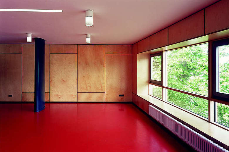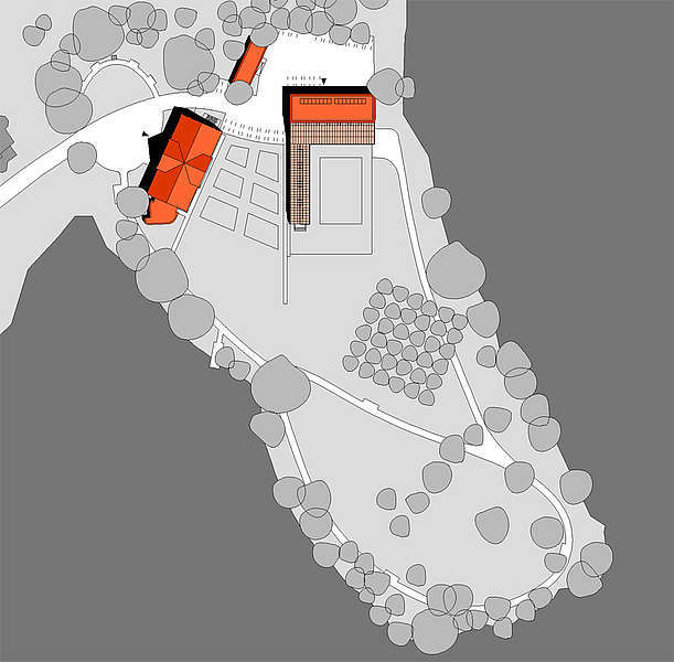Die Behindertengärtnerei bleibt in ihrer Gebäudehöhe unterhalb der Baumkronen und bildet in ihrer kompakten Baukörpergestaltung den geringsten Eingriff in die Landschaft.