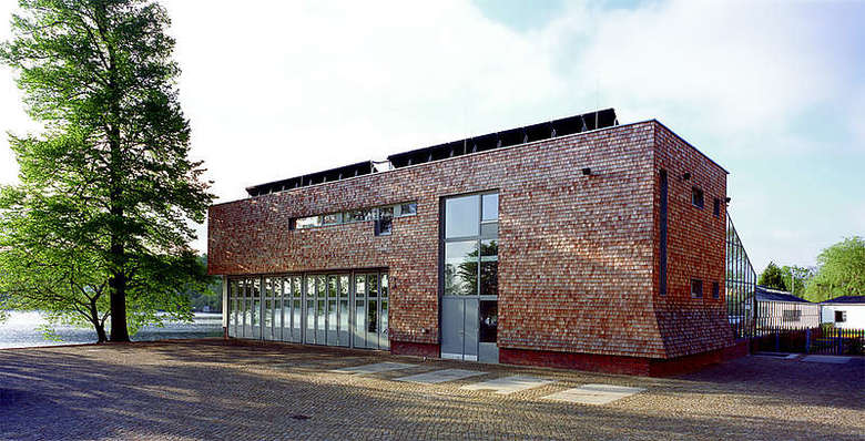 Der Bau erhält eine Lärchenholz-Schindelfassade mit einem Torfbrandklinkersockel. Die Gewächshäuser sind als Stahl-Glas-Konstruktion ausgeführt. Das Dach wird als extensives Gründach mit einer Solaranlage geplant.
