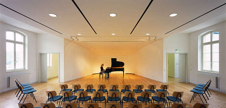Im Erdgeschoss sind um den zentralen Aufenthaltsbereich herum die verschiedenen Schulungsräume angesiedelt; im Gartengeschoss befinden sich die Übungsräume, die besonderen Schallschutz benötigen. Die preußische Kappendecken und gemauerte Gewölbe bieten hier die notwendige Masse. Zusätzlich werden die Räume mit einer biegeweichen Vorsatzschale verkleidet.