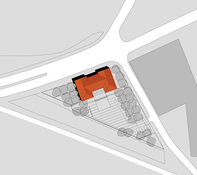 Straßenseitig wird das Gebäude über die zwei historischen Eingangsbereiche im Erdgeschoss erschlossen. Die klare Gliederung führt den Besucher vorbei an den verschiedenen Schulungsräumen in das zentrale Forum, das sich nach Süden öffnet und mittels einer vorgeschalteten Galerie den Austritt in den Wintergarten ermöglicht.