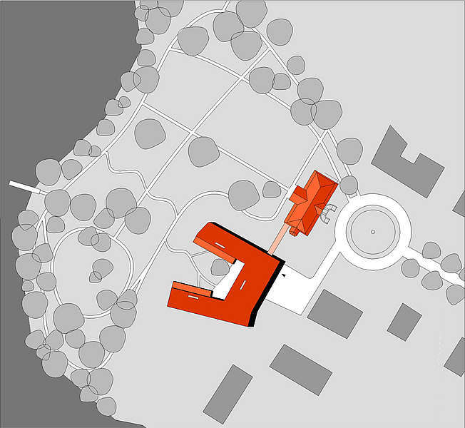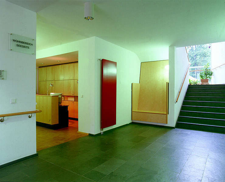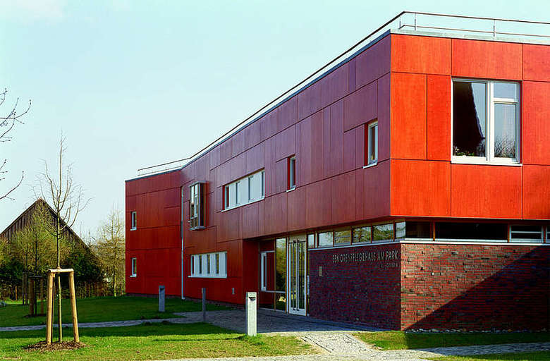 Die Anlage des Pflegeheimes bildet ein spannungsvolles Ensemble aus Alt- und Neubau. Die Sichtachsen des denkmalgeschützten Herrenhauses werden freigehalten, der Neubau ordnet sich dem haupthaus unter und wird so Teil der Parklandschaft am See. Die funktionale Qualität der Anlage wird durch die klare Trennung von Pflegebetrieb im Neubau und den gemeinschaftlichen Nutzungen im Altbau gebildet. Der zweigeschossige Neubau wird in Verbindung mit der Fassadengestaltung aus rot lasierten Birkenholztafeln und Torfbrandklinkern zu einem zurückhaltenden Erscheinungsbild. Durch die Aufweitung des Innenhofes wird eine optimale Durchsonnung der Zimmer erreicht. Es entstehen spannungsvolle Aussen- und Innenräume. Die Zimmer erhalten raumhohe, französische Holzfenster, die allen Bewohnern den direkten Blick auf Park und See ermöglichen. Am Kopf der Gebäudeflügel liegen auf jeder Etage großzügig verglaste Aufenthaltsräume mit Kochgelegenheit und Terrasse. Das dreigeschossige rote Ziegelgebäude, das alte Herrenhaus mit seinem mächtigen Walmdach, bildet den Mittelpunkt des Ensembles und ist über einen filigranen Glasgang mit dem Pflegeheim verbunden.