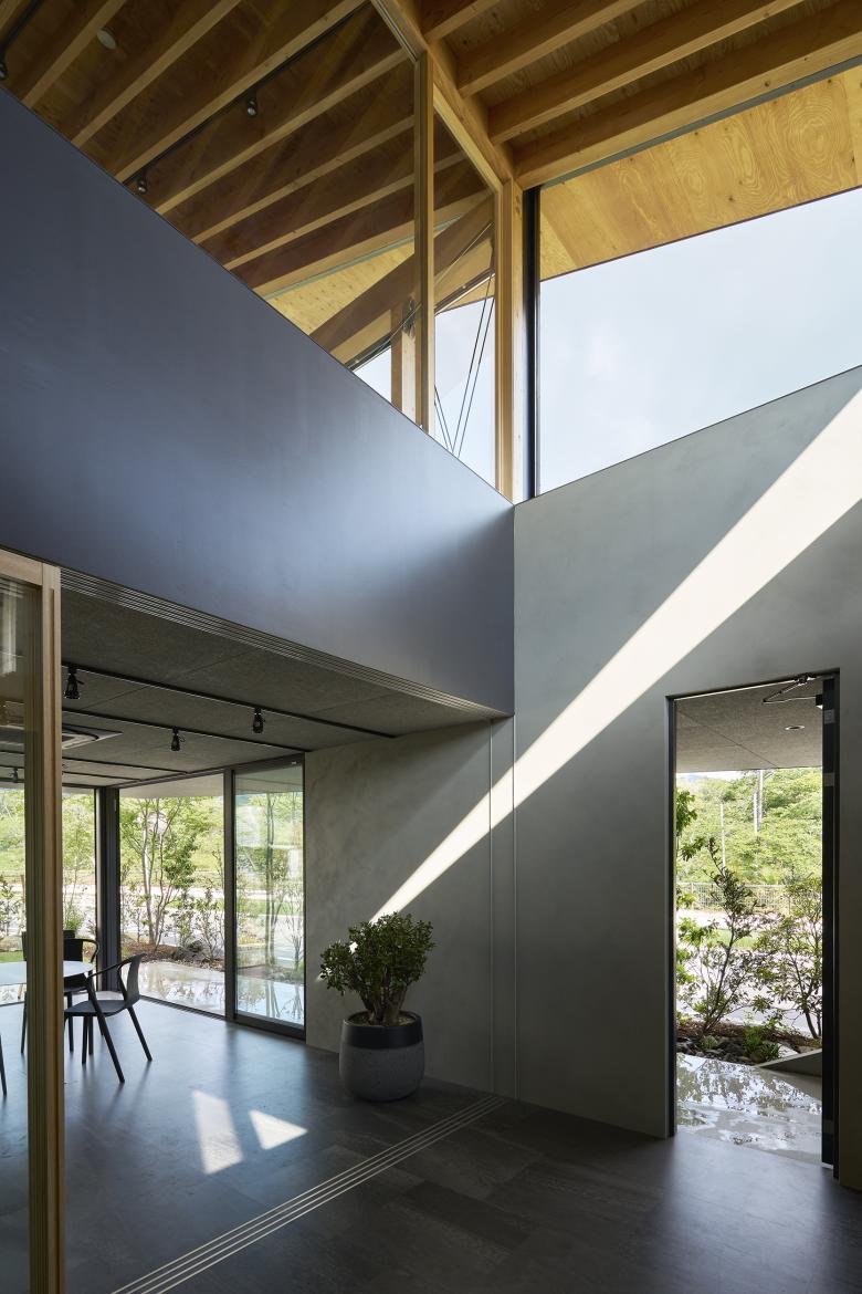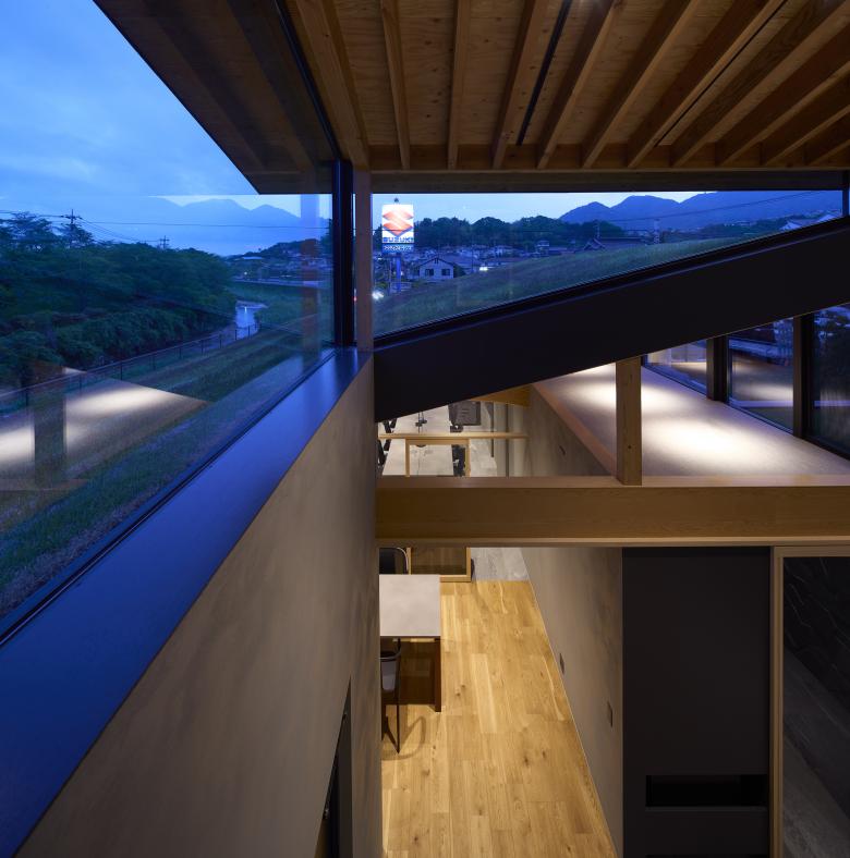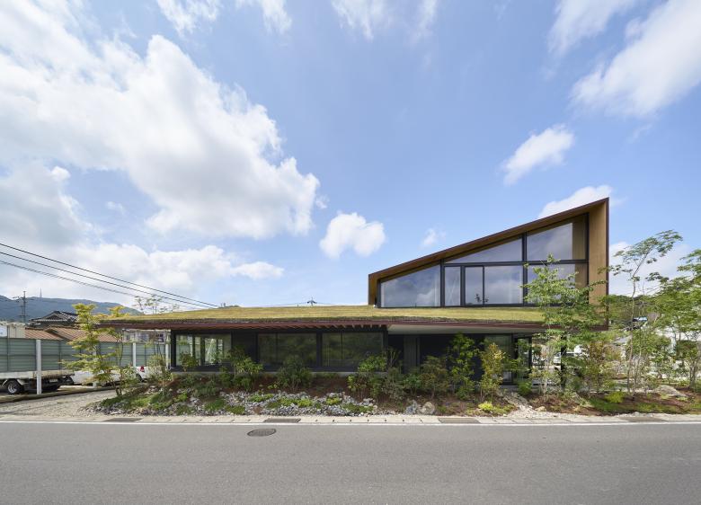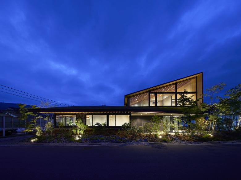 敷地は広島県呉市の山間で、東は本庄水源地という貯水池と、その手前に呉湾まで繋がる二河川が流れる。西は絵下山を中心とした山々が連なり、その麓には新旧の住宅が等高線に沿うように建ち並んでいる。建主は長くこの地で工務店を営んでいることから、地域に貢献できる建築をつくりたいという思いが強く、事務所と住宅の機能に加えて、地域の「会所」としての場を望んだ。