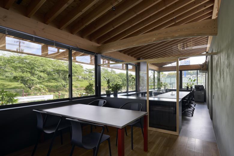 街の工務店という機能を拡張させるため、1階の庭と地続きになるように多目的室を配置した。塀ではなく植栽によって適度に視線を調整することで、利用者の賑わいを地域に届けている。多目的室は地域の人々の様々な活動を支援するための場であり、さらには防災拠点としても計画している。下屋の草屋根は室内の熱負荷の低減に繋がるだけでなく、川沿いが桜並木となる春先には地域の人びとに開放する。建築全体を利用した職住に、「会所」を加えた計画である。