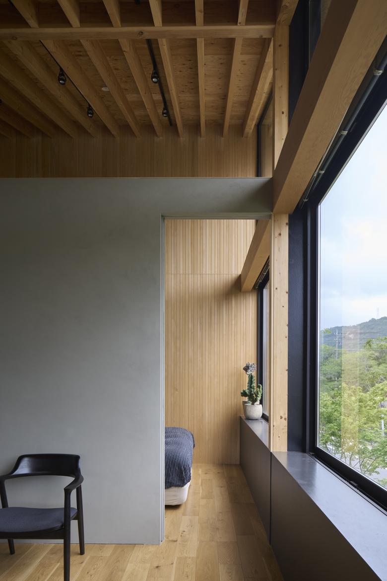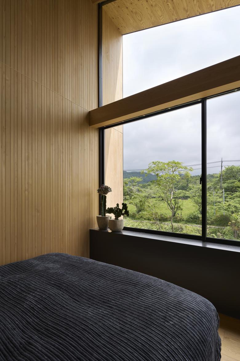 まず屋根の操作によって環境と建築の繋がりをつくり、諸室もそれに準じた配置を行なった。具体的には屋根を1方向に絞るのではなく、貯水池から山並みまでの緑の連続性をつくるための草屋根の下屋、南からの直射を遮り河川の下流から吹く強風を受け流すための主屋、この2方向の屋根の重なりによって全体を統合させている。2階の居住スペースからは草屋根と貯水池を重ねた風景を望みながら暮らすことができ、下屋の諸室は深い軒と地面からもち上がった植栽によって守りながら風景に開いた。