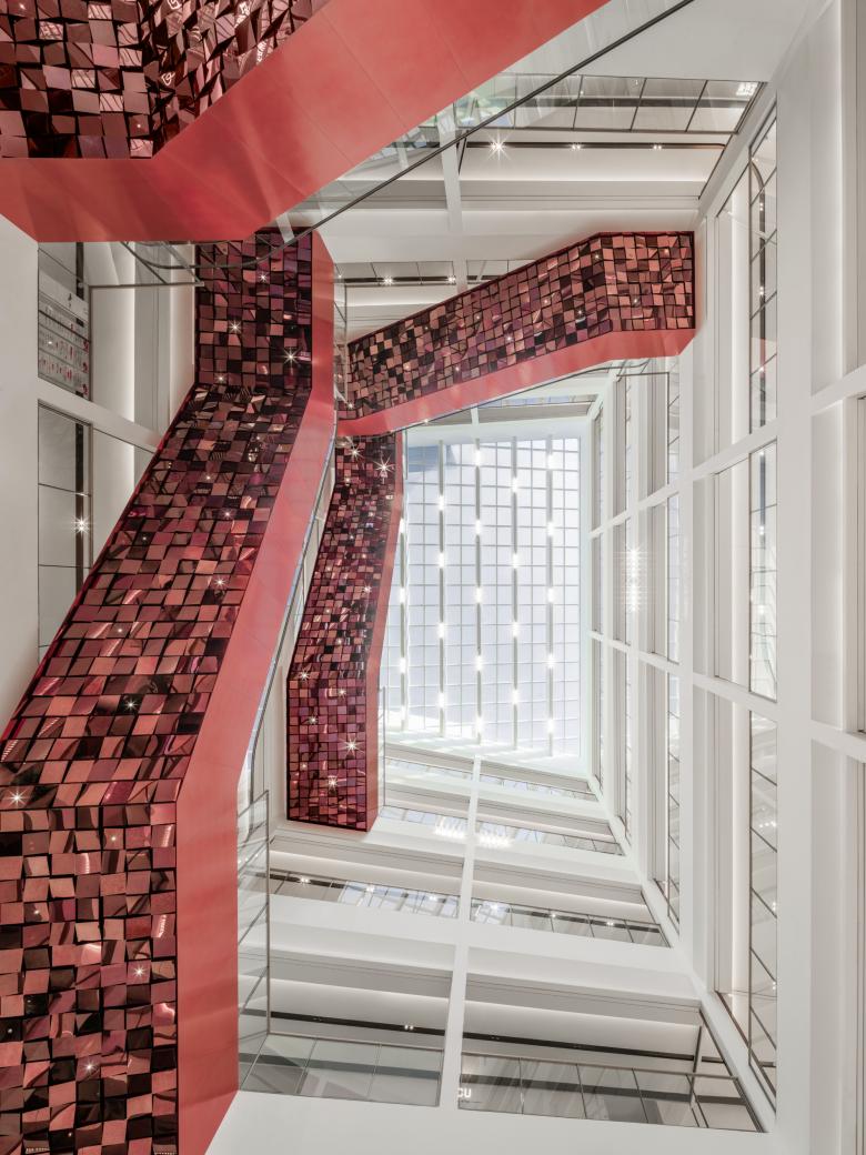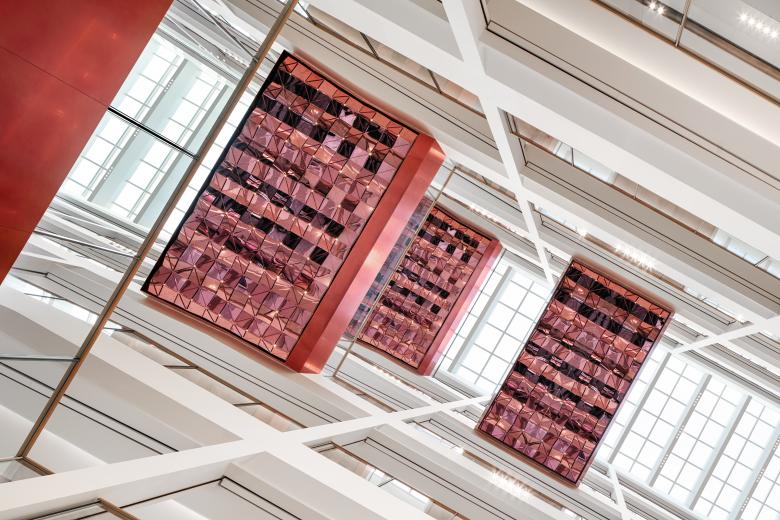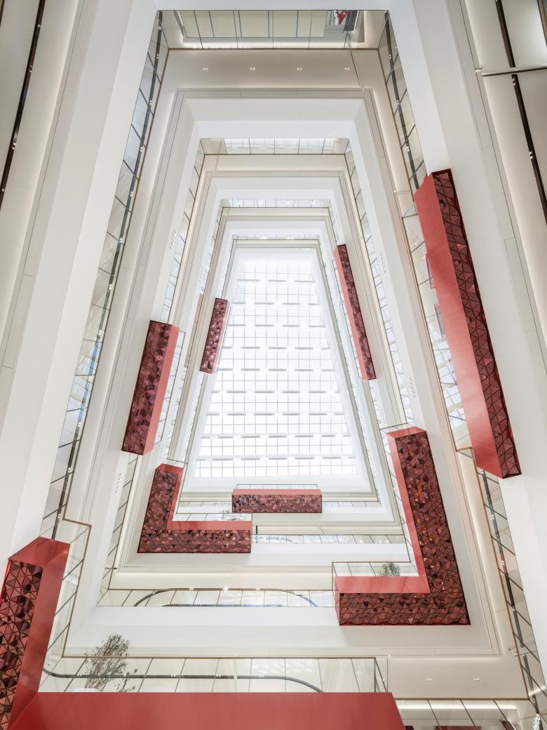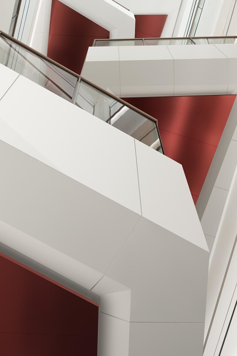 Auch das zentrale Atrium, das ebenfalls von oben belichtet wird, ist von den heimischen Gewässern inspiriert, auf deren Oberflächen sich das Sonnenlicht kaleidoskopartig bricht. In diesem Bereich konzentrieren sich die roten Elemente auf die Balkone, die mit ihren Sitzgelegenheiten und abwechslungsreicher Bepflanzung zu Orten der Begegnung werden. Sie sind mit dreieckigen Metallfragmenten gestaltet, die von unten betrachtet ein dynamisches Spiel an reflektierenden Kubaturen ergeben. Ein integriertes, großformatiges Display dient hier zudem als Infoscreen, aber auch als Kulisse für größere Veranstaltungen, die in regelmäßigen Abständen im Hauptatrium stattfinden. Wie auf einem Marktplatz verändert sich so das Erscheinungsbild des Raums ständig und es entsteht ein flexibler Ort, der je nach Anlass und Bedarf angepasst werden kann.