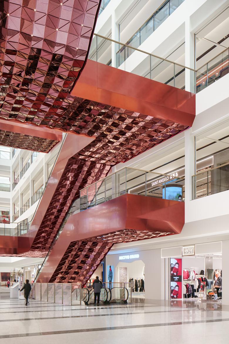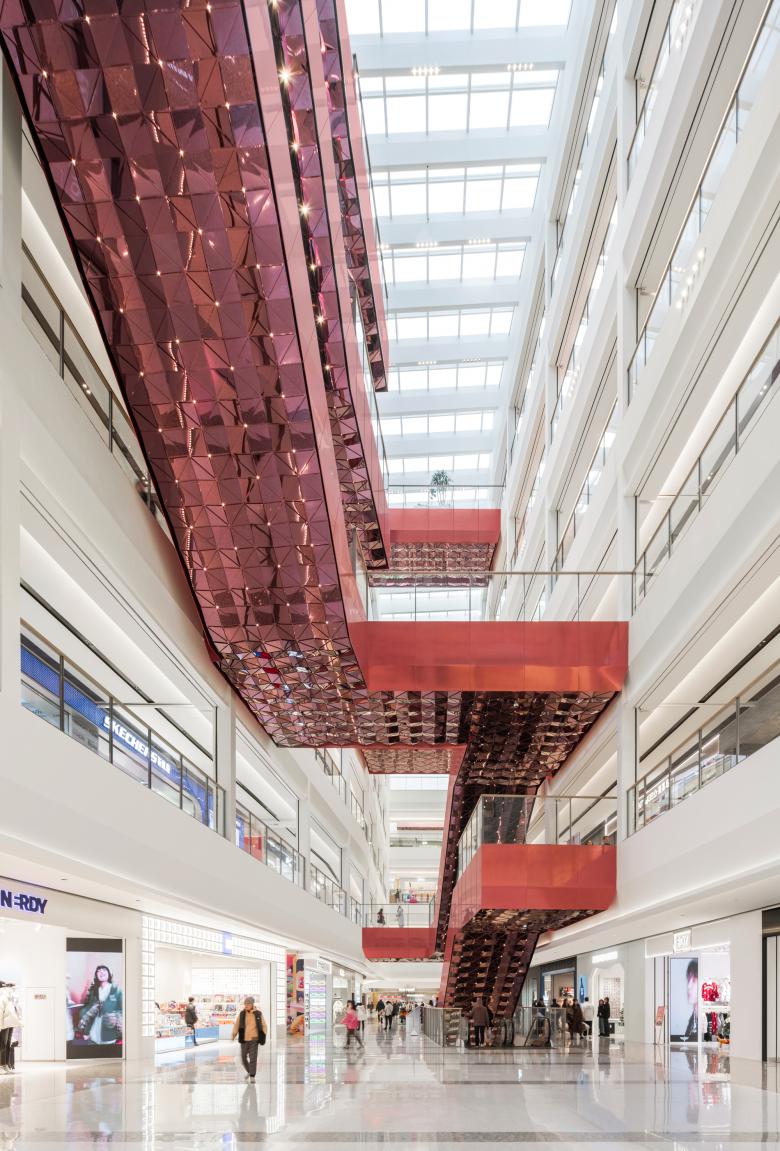 Um den Besuchenden die Orientierung auf der weitläufigen Fläche von 70.500 Quadratmetern zu erleichtern, sind die drei Atrien, die das Einkaufszentrum erschließen, unterschiedlich gestaltet. Allen gemein ist zwar das neutrale Weiß der Architektur, das jedoch durch das leuchtende Rot der raumgreifenden Auf- und Abgänge individuell kontrastiert wird und durch die jeweilige Inszenierung verschiedene merkfähige Räume entstehen.