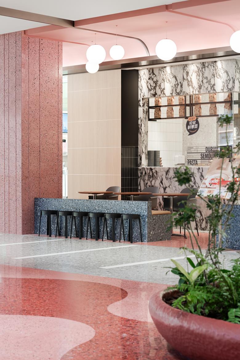 Neben den großzügigen Atrien sind in der Wuxi MixC Mall eine Reihe weiterer öffentlicher Plätze entstanden, die soziale Interaktion und kollektive Erlebnisse fördern. Einer der wichtigsten und größten ist etwa der Food Court „Yummy“ im Untergeschoss, der nicht nur gastronomische Vielfalt, sondern auch die Möglichkeit zum persönlichen Austausch bietet: In einem zentralen Bereich, der von einer markanten Deckeninstallation – einer spielerischen Adaption des roten Leitmotivs – gefasst ist, stehen den Gästen zum Teil begrünte Sitzinseln zur Verfügung, die jeweils an den Seiten durch zusätzliche Sitzgelegenheiten zum gemeinsamen Essen und Verweilen ergänzt werden.