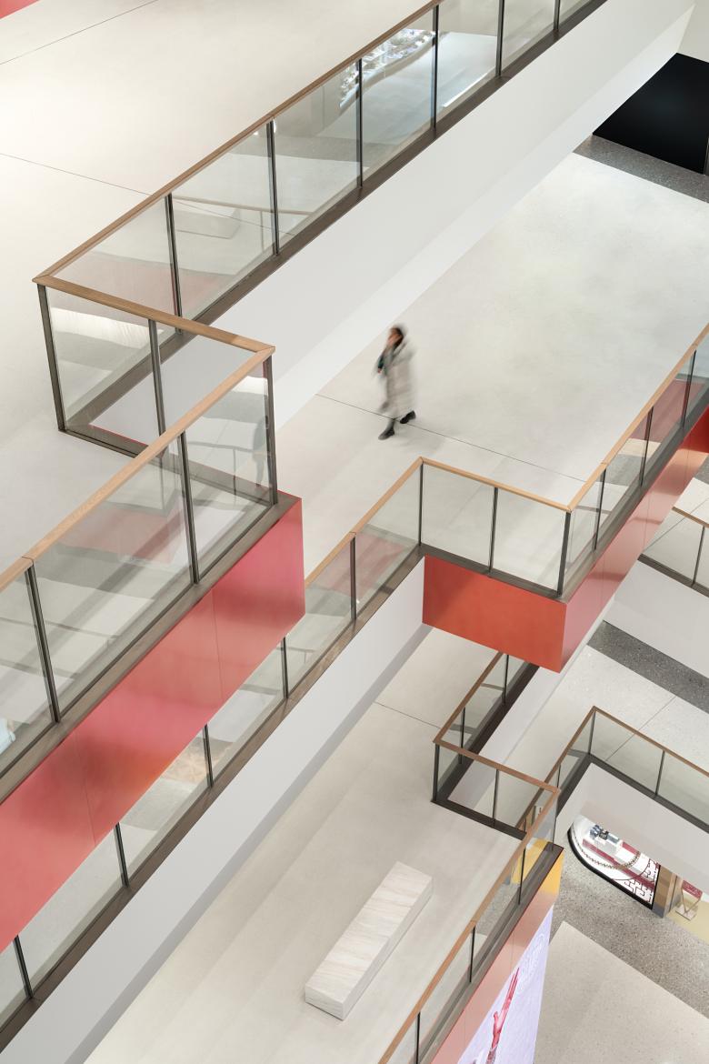 Im westlichen Atrium lenkt die installative Anordnung der Rolltreppen den Blick direkt nach oben: Wie die Äste eines Baumes verzweigen sich die Zugänge in die jeweiligen Geschosse und referenzieren mit ihren quadratischen Metallplättchen auf die gepflasterten Pfade am Seeufer und in den historischen Gassen.