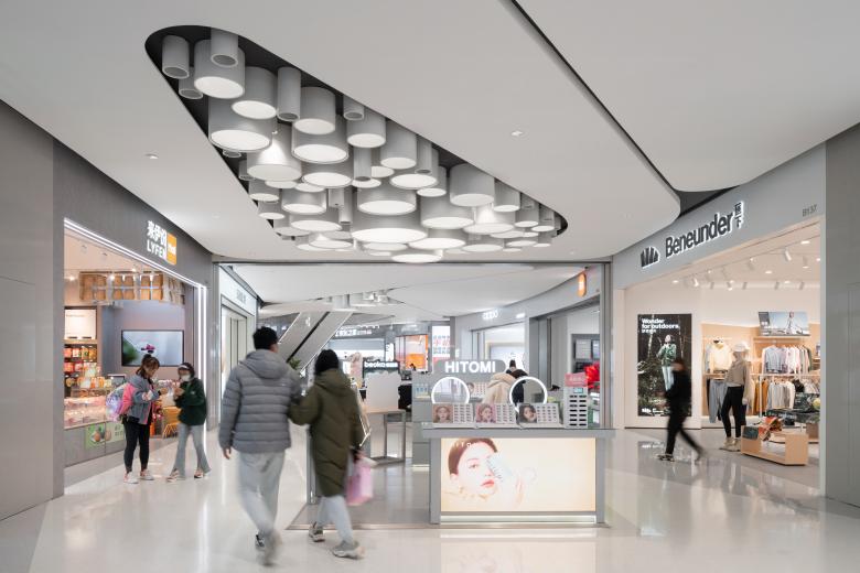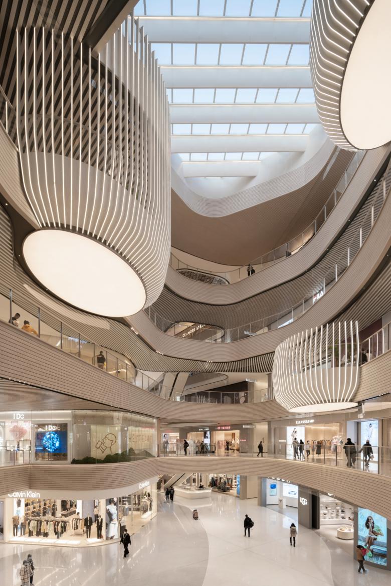 Visuelle Highlights der Mall sind die beeindruckend großen Atrien, die dank großzügiger Oberlichter von natürlichem Licht durchflutet sind. Die einzelnen Ebenen sind in organischen Formen vielfältig um den Luftraum modelliert. So schichten sich die Atrien wie die unregelmäßigen Versprünge einer Felsinsel in die Höhe. Gleichzeitig entstehen auf den verschiedenen vertikalen Niveaus Sichtbeziehungen zwischen den Galerien, die die Besucher:innen neugierig machen und sie animieren, das Gebäude zu erkunden. Die gesamte Mall erscheint so als großer skulpturaler Raum, der klar und übersichtlich wirkt und zugleich überrascht.