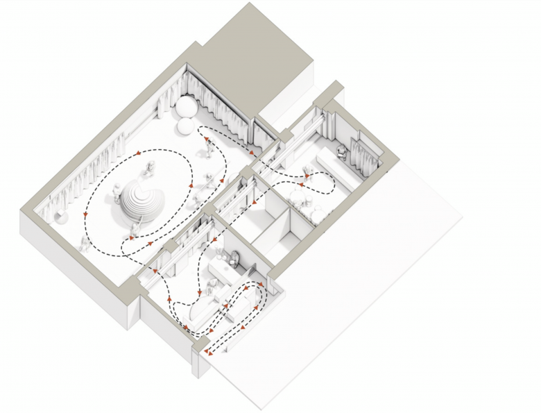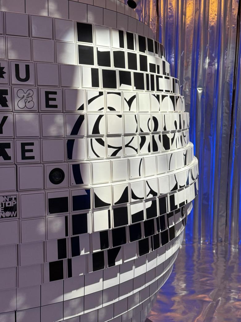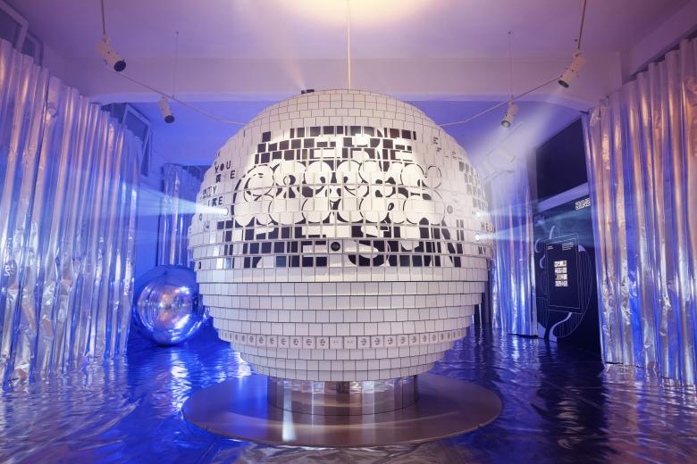Eine Ballettschule im Hinterhof der Via Palermo 1: Mit einem reflektierenden Banner locken wir die Besucher die Treppe hinunter. Hier wie auch im Hauptraum bedecken lichtreflektierende Vorhänge aus Papier die Wände und leiten die Gäste in einen Raum, dessen Grenzen sich aufzulösen scheinen. Im Zentrum des Raums steht eine Kugel, bestückt mit hunderten JUNG Lichtschaltern. Diese sind bedruckt mit Buchstaben und Grafiken, die sich zu Worten formen. Man muss sich nicht auskennen, um darin Songtexte zu lesen. Dank Ohrwurmpotential spielt im Kopf sofort die Melodie und der Körper wippt im Rhythmus.