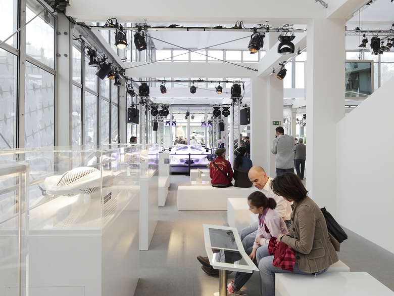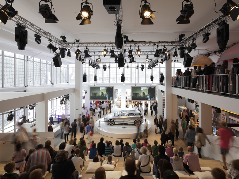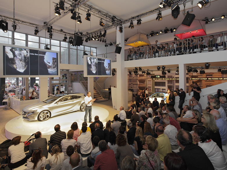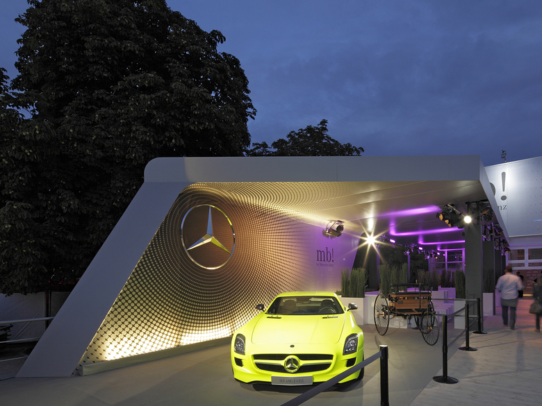 Ziel war es, einen temporären Pavillon mit einer markanten Außenkommunikation zu gestalten. Als Ausgangspunkt diente ein standardisiertes Zeltbausystem auf Mietbasis, dessen unspektakuläre Alltags-Architektur durch gestalterische Eingriffe transformiert wurde. Die Konstruktion wurde durch ein formal unkonventionelles Vordach ergänzt und mit einer einprägsamen, bildhaften Außenhaut aus Mesh-Gewebe bespannt, dessen Bahnen bis zu einer Fläche von 10 x 35 Metern verschweißt wurden. Grundlage des Grafikdrucks bildeten Motive aus der Designstudie zur A-Klasse von Mercedes-Benz. Auf diese Weise entstand eine unverwechselbare Markeninszenierung.