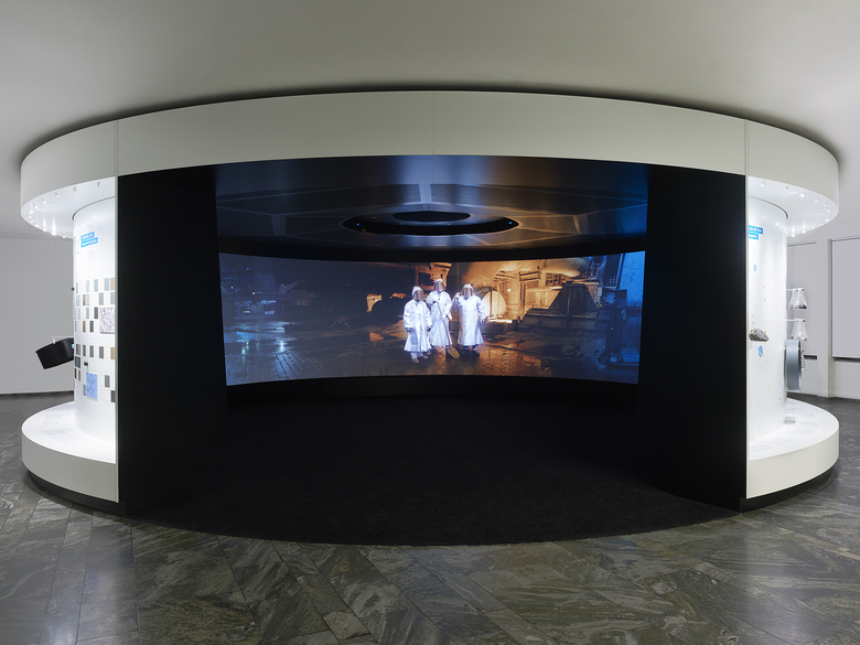 Der virtuelle Innenraum ist ein Holodeck des Stahls: Der mit Drohnen gefilmte Panoramafilm nimmt die Besucher mit an Orte, die für Menschen viel zu gefährlich wären, und bietet damit bisher ungesehene Perspektiven: über Erzhalden, in den Hochofen und vorbei an Arbeitern mit silberner Schutzkleidung in glühendes Eisenerz, mit orange-leuchtenden Brammen durch die Walzen, um gleich darauf neben einem hocheffizienten, sicherheitsrelevanten Strukturteil eines Automobils wieder aufzutauchen. Begleitet wird diese Reise von Interviews mit authentischen Mitarbeitern von thyssenkrupp.