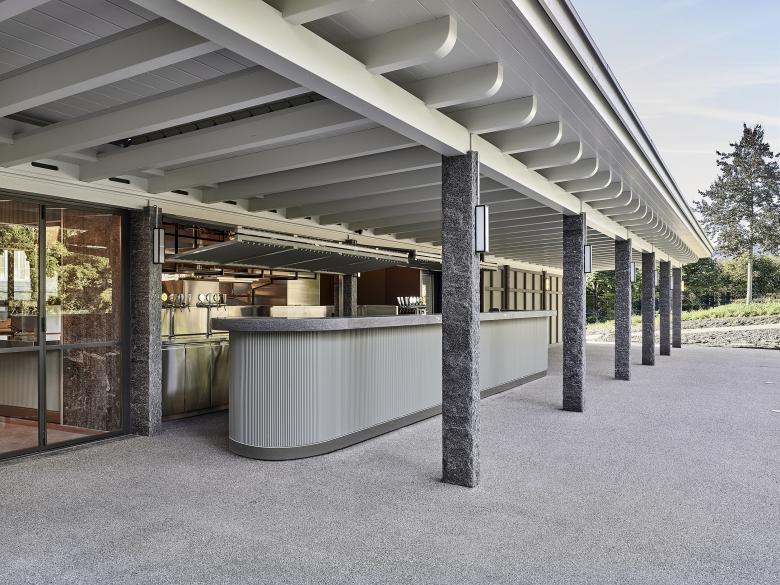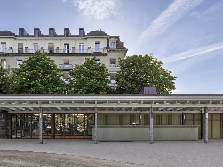Das Parkcafé mit dem Namen Milchbar liegt im Stadtpark «Kleine Schanze», wenige Schritte vom Bundeshaus entfernt. Der Pavillon wurde 1945 als offene Trinkhalle auf der zur Promenade umgestalteten barocken Stadtbefestigung errichtet. Diverse zwischenzeitliche An- und Umbauten verunklärten die ursprünglich klare Formensprache des Gebäudes. Der erfolgreiche Saisonbetrieb hat sich in den letzten Jahren zu einem beliebten Treffpunkt für ein breites Berner Publikum entwickelt. Infolge gravierender baulicher und betrieblicher Defizite wurde der Gastronomiebetrieb mit 180 Sitzplätzen im Winter 2023/2024 vollumfänglich saniert und umgebaut. Dabei wurde die ursprüngliche Pavillonform wieder hervorgehoben und die verunklärenden Anbauten rückgebaut. Eine neue Pergola in der Formensprache der ursprünglichen Trinkhalle schafft einen starken Bezug zum Park. Typische Elemente aus den 1940er-Jahren wie die Stützen und Schwellen aus Maggia-Gneis sowie die Dachkonstruktion mit sichtbaren Sparren wurden erhalten, wiederverwendet und in den neuen Gebäudeteilen weitergeführt. Dadurch wird die graue Energie erhalten, die Kreislaufwirtschaft gefördert und die Identität des Ortes gestärkt. Der bestehende Pavillon und die neue Pergolakonstruktion mit grosszügigen Feldern aus verstellbaren Lamellen bilden zusammen ein markantes Schmetterlingsdach. Filigrane Faltschiebefenster und Klappladen bilden eine durchlässige Gebäudehülle zum Park, gleichzeitig spannen tektonisch gegliederte Sandsteinprofile den Bogen des sorgfältig sanierten Parkcafés zur dahinter liegenden Berner Altstadt.