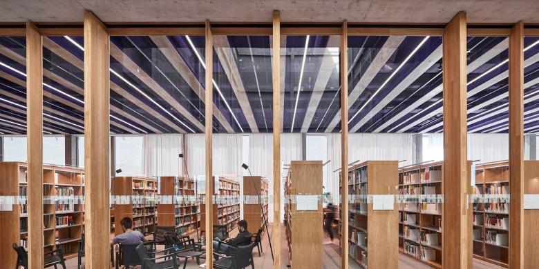 Blick vom Atrium in die Bibliothek auf der „Beletage“im dritten Obergeschoss. Auch hier sind dieÜberströmelemente INDUSILENT in die Trennwände integriert.