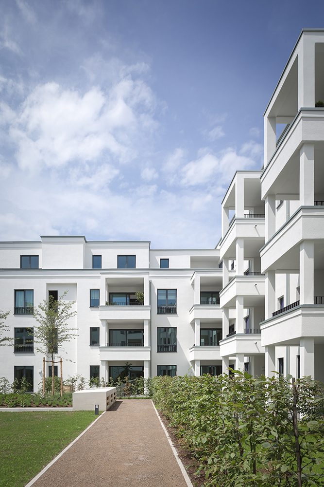 Die vier- bis fünfgeschossigen Stadtvillen sind im Norden miteinander verbunden und ermöglichen im Süden als freistehende Volumen Blickbeziehungen zwischen Innenhof und angrenzendem Park. Alle Zwei-, Drei-, Vier- oder Fünf-Zimmer-Wohnungen verfügen über eine Terrasse, einen Balkon oder einen Garten. Besonders großzügig gestaltet sind die Staffelgeschosse, die sich durch umlaufende Terrassen und Grundrisse mit über 140 m² auszeichnen. Der Baustil passt sich dem klassischen Villenstil mit klaren geometrischen Formen und der reinweißen Fassaden der Umgebung an.