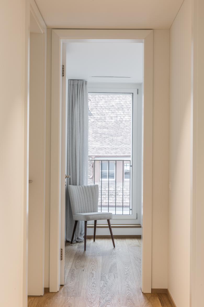 Das Haus definiert sich aus einem Sockel in Stein, welcher der nötigen Widerstandsfähigkeit im städtischen Umfeld gerecht wird und die Schaufenster beinhaltet, zwei Obergeschossen und einem ruhig ausformulierten Attikageschoss. Der feine Rücksprung beim Dachrand zum Attikageschoss hin vervollständigt die angestrebte Fassadengliederung und vermittelt im Gassenraum zwischen den benachbarten Bauwerken.