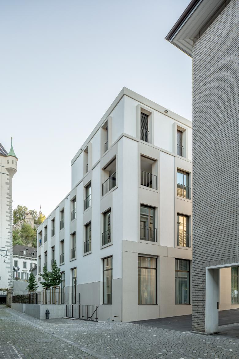 Der Eingliederung zu den benachbarten denkmalgeschützten Bauwerken wurde grosse Beachtung geschenkt. In diesem geschichtlich sensiblen Umfeld gilt es, die aus denkmalpflegerischer Sicht wertvollen Nachbarhäuser wie das Bölsterlihaus aus den frühen 1950er-Jahren und das spätklassizistische Wohnhaus am Schlossbergplatz 2 (Baujahr 1863) zu beachten. Auch der Stadtturm in seiner Erscheinung als Wahrzeichen Badens darf nicht beeinträchtigt werden.
