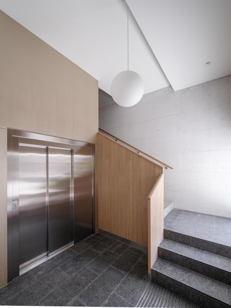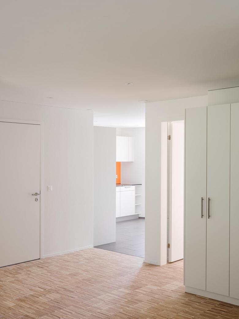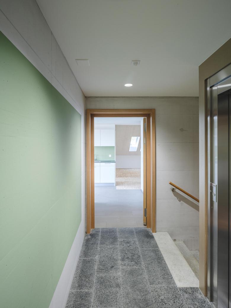 Das gewählte Giebeldach und die Bänderung der Fassade sind eine bewusste spielerische Reaktion auf das dörfliche Umfeld. Die eingezogenen Loggien gewähren jeder Wohnung die nötige Privatsphäre im engen Umfeld der Kernzone. Die korridorfreien Grundrisse und die diagonalen inneren Durchblicke lassen trotz der eher ökonomisch organisierten Wohnungen eine gewisse räumliche Opulenz erahnen. Die Kombination von Naturstein, Holz und Sichtbeton bezeugen eine vornehme Zurückhaltung in der Materialwahl.