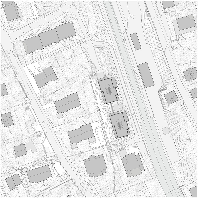 Die neu erstellte Weingartenstrasse trennt das langgezogene und leicht erhobene Areal von den Gleisen der SBB. Bergseitig gegen Westen reihen sich in einer zweiten Bebauungslinie bestehende giebelständige Mehrfamilienhausbauten so aneinander, dass die dazwischen liegenden Freiräume die Sicht in den Hang freilegen. Gegen Süden schliesst ein neues Mehrfamilienhaus die erste Bebauungslinie ab. Gegen Norden aber folgt eine stadträumliche Freifläche, die bis zum Bahnhof reicht und über die auch erschlossen wird. Die städtebauliche Körnung des betrachteten Siedlungsfeldes, in das die Neubauten zu integrieren sind, ist daher von grossen regelmässig gesetzten Solitärbauten geprägt.