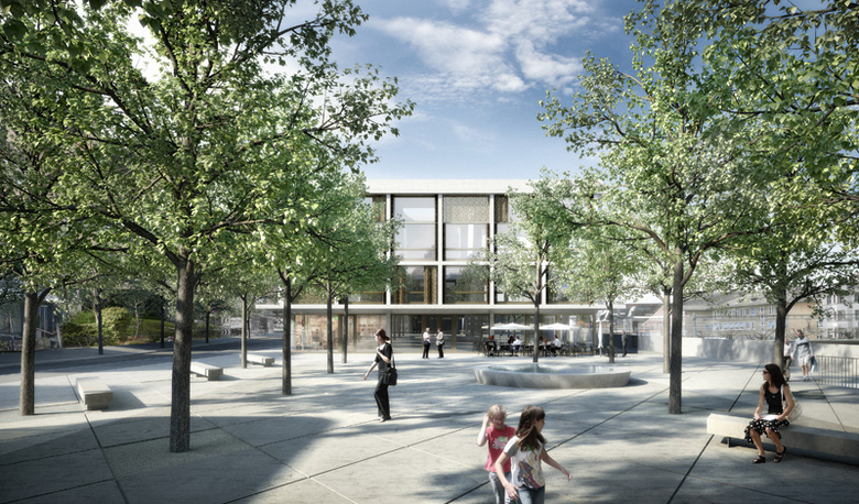 Das neue Zentrum in Küsnacht wird ein Ort des Geschehens; ein urbanes Feld im dörflichen Massstab, das sich als öffentlicher Platz zwischen der Zürichstrasse und dem tiefer liegenden Bahnhof etabliert. Die Verfassenden verfolgen einen klassischen Ansatz von Platzraumgestaltung, bei dem einerseits die Gebäudereihe der Zürichstrasse den Aussenraum begrenzt und andererseits die beiden neu gesetzten Volumen je eine Platzfassade bilden. Dieser Aussenraum öffnet sich als erhobene und unterbaute Terrasse gegen Westen mit breiter Sicht auf See und Berge.