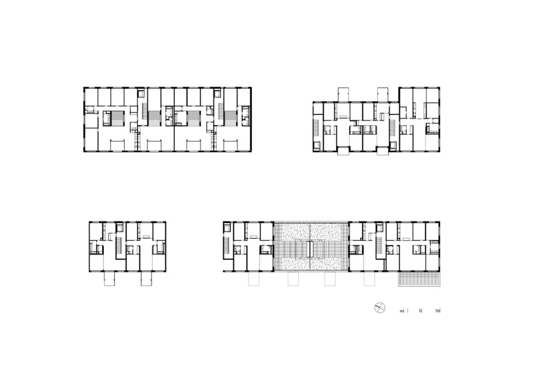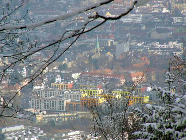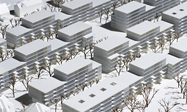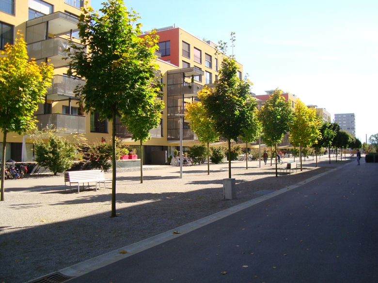 Die in lange Bauzeilen gegliederte Stadtsiedlung wird durch einen wiederkehrenden Wechsel von städtischen Freiräumen und parkähnlichen Grünräumen charakterisiert. Von jeder Ost-West ausgerichteten Wohnung aus ist der Bezug sowohl zu einem „Stadt“- als auch zu einem Grünraum vorhanden. Die langgezogenen Freiräume zwischen den Gebäudezeilen werden durch unterschiedlich dimensionierte Querverbindungen zu einem dichten Wege- und Platznetz ergänzt.