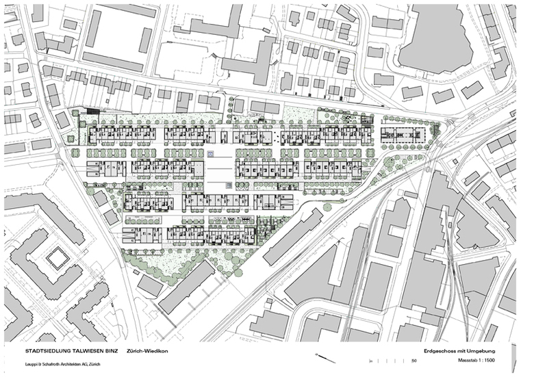 Die Stadtsiedlung Talwiesen Binz gliedert sich in vier lange Gebäudezeilen, deren vor- und rückspringende Gebäudefluchten ein abwechslungsreiches Raumerlebnis generieren. Dank der unter den Gebäudezeilen liegenden Tiefgarage, deren Einfahrten in die Zeilenköpfe integriert sind, werden die Aussenräume der Siedlung vom Verkehr freigehalten.