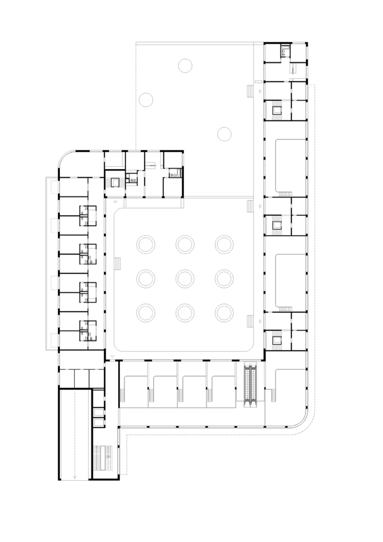 Ein aufgeschnürter Hofrand mit zwei freien Armen verankert sich städtebaulich an der Baulinie entlang der Albisriederstrasse und entwickelt sich nach Norden. Die beiden freien Enden öffnen sich asymmetrisch, um mit dem Umfeld der alten Mühle einen übergreifenden Freiraum zu bilden, der sich als Freihaltezone bis weit in den Norden erstreckt. Die ganze Gebäudeanlage versteht sich damit auch als Termination des Freiraumgürtels gegenüber dem neuen Zentrum in Albisrieden.