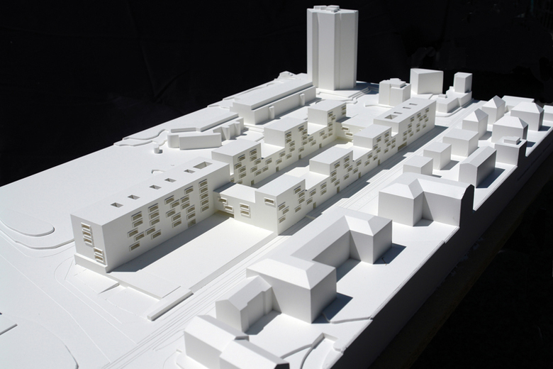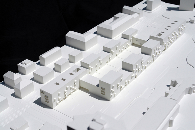 Für die Aufwertung der Grünau wird eine Gebäudeanlage entwickelt, die sowohl die hohen Anforderungen in das eigene Wohnumfeld erfüllen will als auch eine städtebauliche Brücke zwischen den losen Teilen des Quartiers zu bilden vermag. Die vorgeschlagene Grossform ist die urbane Antwort auf die bestehenden Hochhäuser und die grossmassstäbliche Gebäudeanlage der Tüffenwies. Dabei bildet der Zusammenbau die Kulisse für die angestrebte städtebauliche Dichte. Der Plot der Gebäudeanlage generiert einen Wohnhof und zwei öffentliche Plätze unterschiedlichen Charakters. Alle drei Aussenräume leisten ihren spezifischen Teil zur Aufwertung des Ortes.
