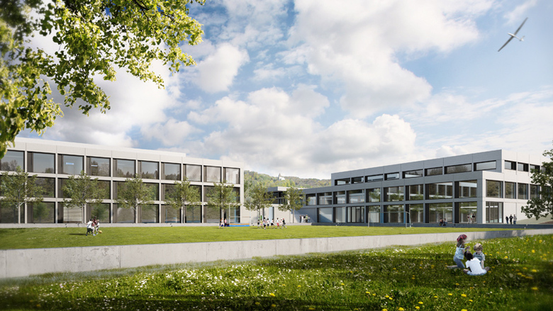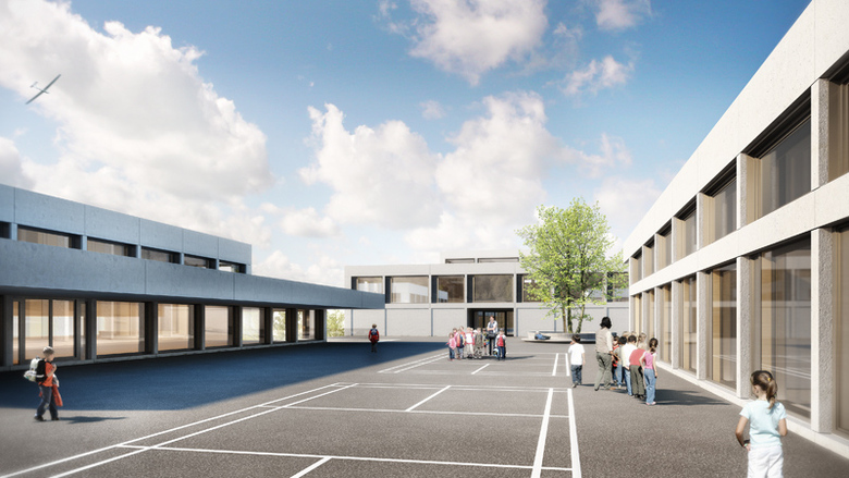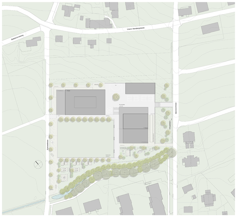 Andererseits werden die Schüler und Schülerinnen das Schulareal vorwiegend über die Maienrainstrasse erreichen, weshalb die Projektverfasser im Nordosten einen zentralen Empfangs-, Schul- und Spielhof vorschlagen, um den sich die drei betrieblich komplett unabhängig nutzbaren Schulbauvolumen anlagern. So entsteht bereits ab der ersten Bauetappe ein massstäbliches Ensemble mit Schulgebäude, Turnhalle und Mehrzweckraum.