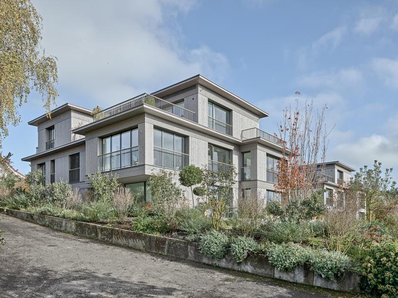 Die beiden Gebäude beinhalten je vier Wohnungen unterschiedlicher Lage und Grösse, die über ein zentrales Treppenhaus erschlossen werden. Das Angebot reicht von grossen Gartenwohnungen über kleinere und mittlere Geschosswohnungen mit wetter-unabhängigen Vier-Jahreszeiten-Zimmer bis zu den Attikawohnungen mit allseitigen Terrassen-Decks. Alle Wohnungen sind stark mit dem intensiv bepflanzten Grünraum in Wechselwirkung.